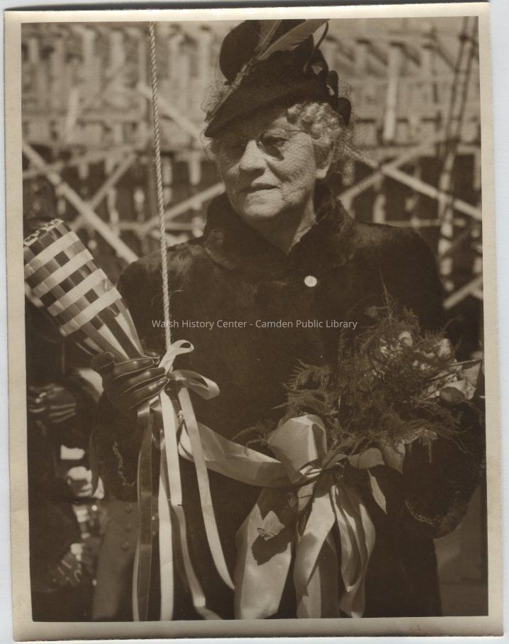 Mrs. Mary Lyman, mother of Richard Lyman (president of Camden shipyard) holds the bottle of champagne that will be used by First Lady Eleanor Roosevelt to christen the barge "Pine Tree." The 194-foot barge "Pine Tree" was the largest wooden vessel built in the nation since the 1920s, and was the first of many to be built to relieve the fuel transportation problem by carrying coal. Members of the Penobscot tribe performed ritual dances to give the ship good luck.Collection