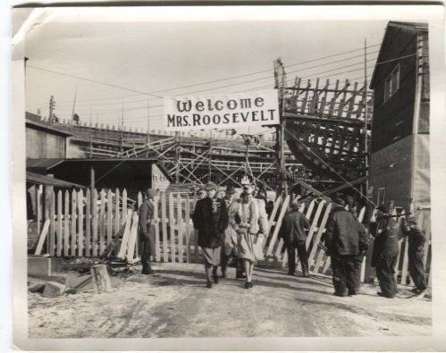 First Lady Eleanor Roosevelt arrives at the Camden shipyard for the launch of the "Pine Tree" barge, accompained by Lois Lyman, wife of Richard Lyman, president of the shipyard. The 194-foot wooden barge was the largest wooden vessel built in the nation since the 1920s, and was the first of many to be built to relieve the fuel transportation problem by carrying coal. Members of the Penobscot tribe performed ritual dances to give the ship good luck, and the vessel was christened by Eleanor Roosevelt.Collection
