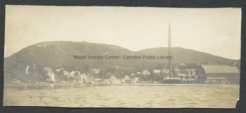 One 2 x 5" photograph of Camden harbor. View of inner Camden harbor with Bean shipyard on right and Mt. Battie and Mt. Megunticook in the background.Collection