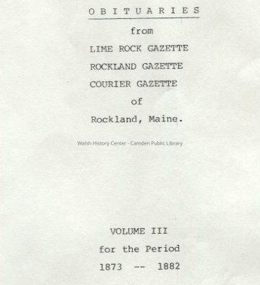 a transcription of obituaries from the Lime Rock Gazette, Rockland Gazette, Courier Gazette of Rockland, Maine for the period 1873-1882