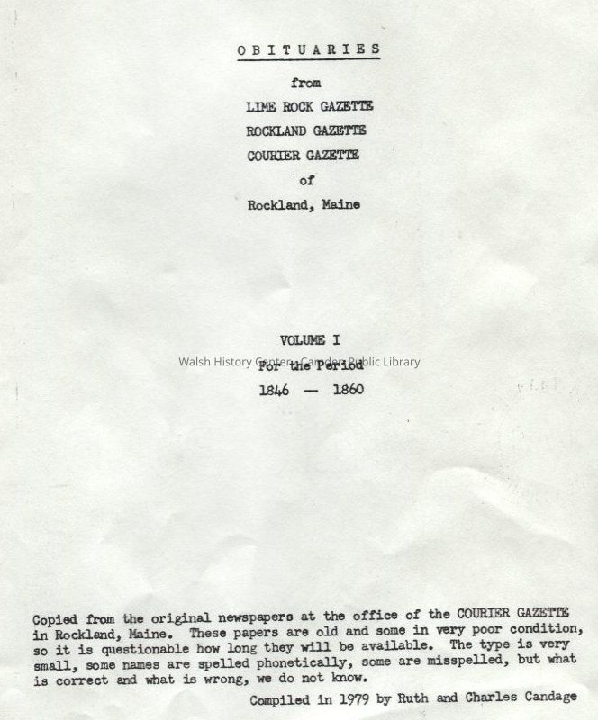 Obituaries from Lime Rock Gazette, Rockland Gazette, Courier Gazette of Rockland, MaineEntry/Object ID