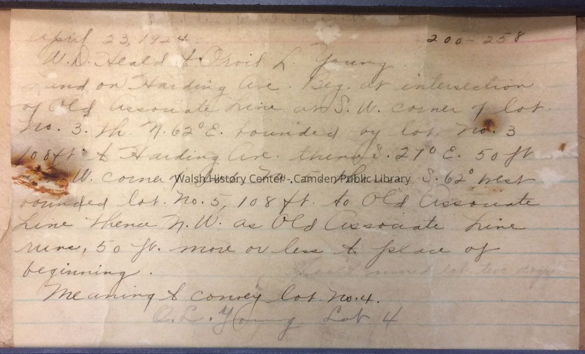 Land on Harding Ave. Beg. at intersection of Old Associate Line at S.W.corner of lot no. 3. th. N.62°E. bounded by lot. no. 3 108 ft. to Harding Ave thence 27°E. 50 ft to [?.]W. corner of Lot No. 5. Thence S. 62°West bounded lot. no. 5, 108 ft to Old Associate Line thence N.W. as Old Associate Line runs, 50 ft. more or less to place of beginning.