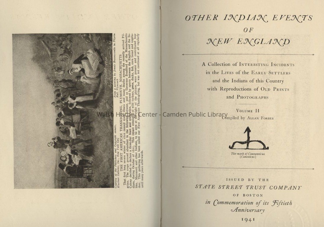 a collection of interesting incidents in the lives of the early settlers and the Indians of this country, with reproductions of old prints and photographs / volume II, compiled by Allan Forbes : issued by the State Street Trust company of Boston in commemoration of its fiftieth anniversary, 1941.Description