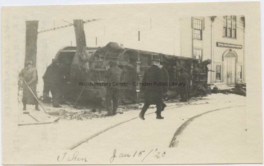 Photograph of the trolley accident by the Rockport Opera House on January 15, 1920.Collection