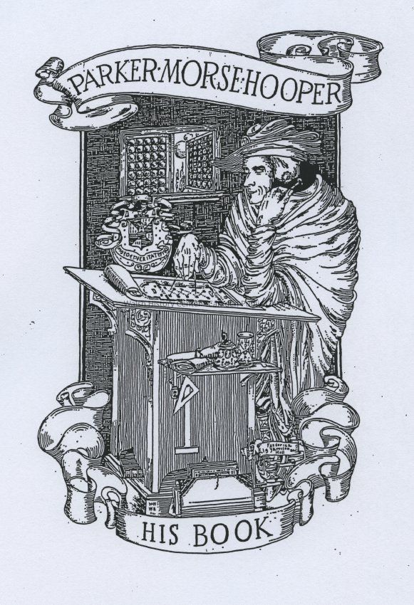 Three photocopy reproductions of a bookplate made for Parker Morse Hooper. The plate was designed by etcher Frederick Garrison Hall, likely sometime during the 1910's. Also included is a photocopied page bearing two names, Harry Morse Payne and Parker Morse Hooper, with no explanation provided--Hooper did have a cousin named Harry Morse Payne (1877-1932).Collection