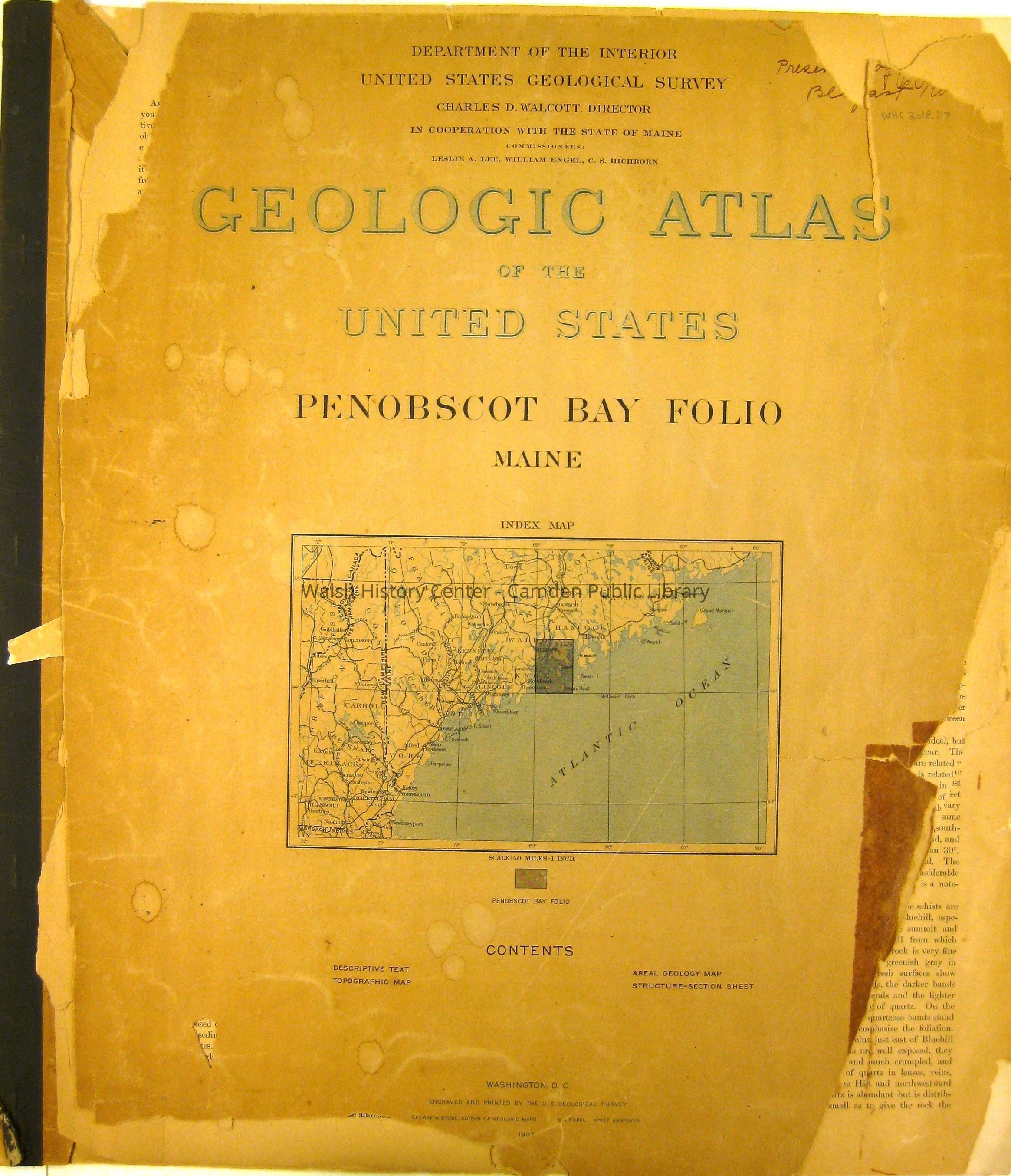 PENOBSCOT BAY FOLIO, GEOLOGIC ATLAS OF THE UNITED STATES, 1907. 3 pages of introduction, 14 pages of description, 3 Maps: Topography; Areal Geology; Structure Sections.Collection