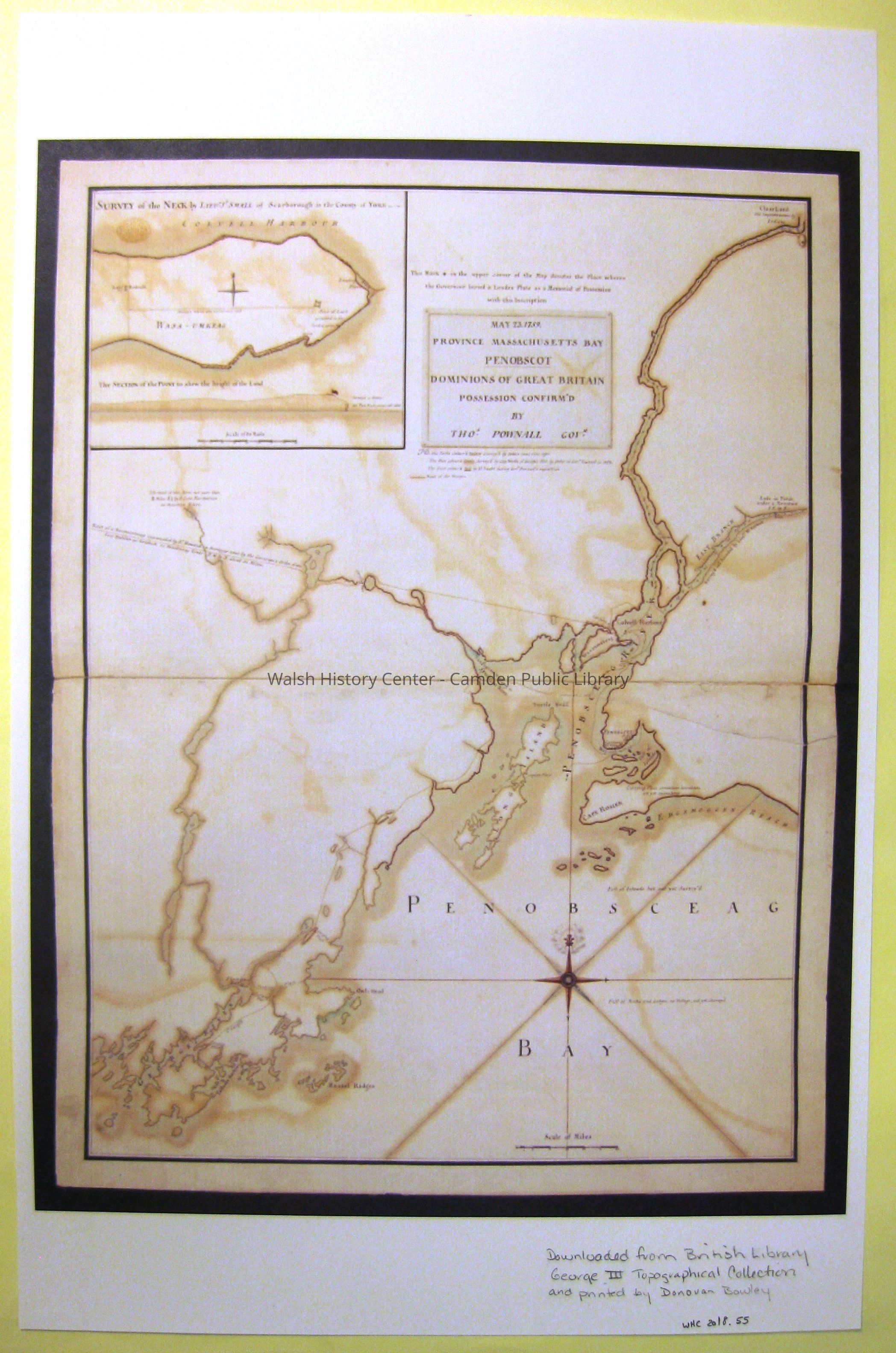 PENOBSCOT EXPEDITION of 1759 - Province Massachusetts Bay, Penobscot, Dominions of Great Britain Possession Confirm'd by Thos. Pownall Govr May 23, 1759. This copy was downloaded from the British Library George III Topo collection and printed by Donovan A. R. Bowley.Collection