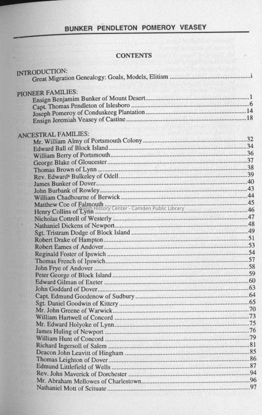 Biographical essays on settlers of Penobscot, Maine focusing on the pioneer families of Ensign Benjamin Bunker of Mt. Desert, Capt. Thomas Pendleton of Islesboro, Joseph Pomeroy of Conduskeeg Plantation, and Ensign Jeremiah Veasey of Castine.