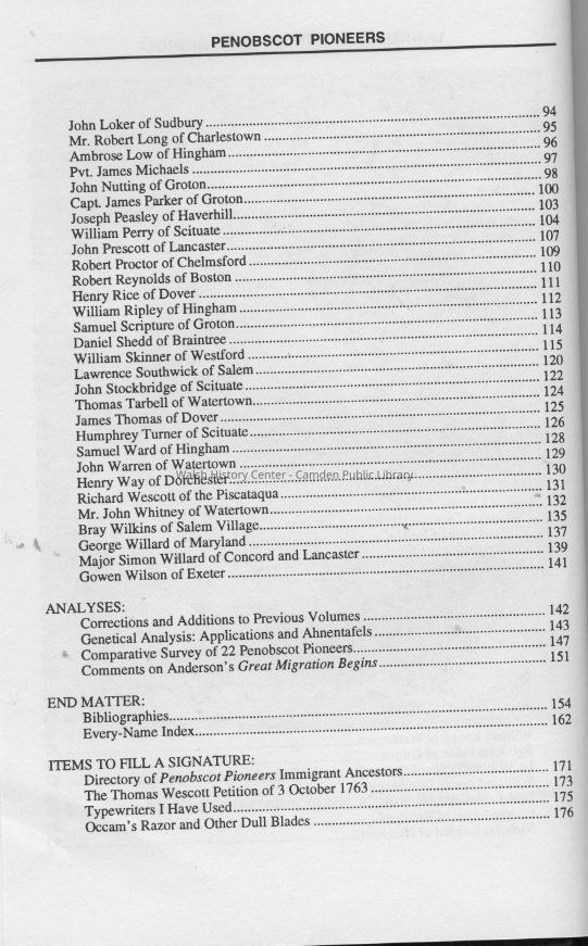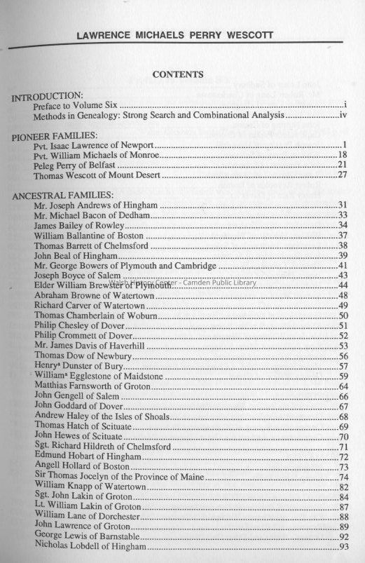 Biographical essays on settlers of Penobscot, Maine focusing on the pioneer families of Pvt. Isaac Lawrence of Newport, Pvt. William Michaels of Monroe, Peleg Perry of Belfast, and Thomas Wescott of Mount Desert.