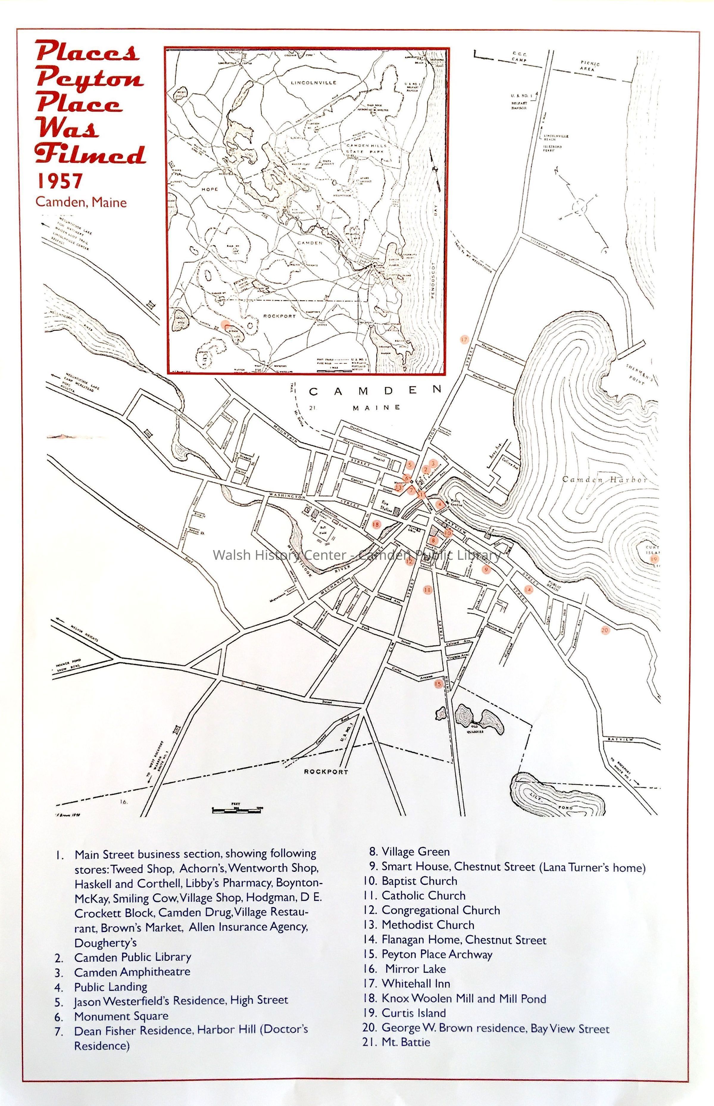 PEYTON PLACE locations, filmed in Camden in 1957. This map shows the locations where Peyton Place was filmed in Camden. It covers the area between Camden's Rockport and Lincolnville boundaries, and depicts roads and their names in black, with numbered locations in red on the primary map. There is an area-wide inset map covering Camden and parts of Rockport, Hope, and Lincolnville and depicting area shots in red shading and shot site locations are numbered in red ink. The key to the numbered locations appears in blue ink at the foot of the map. There is a scale in feet.Collection