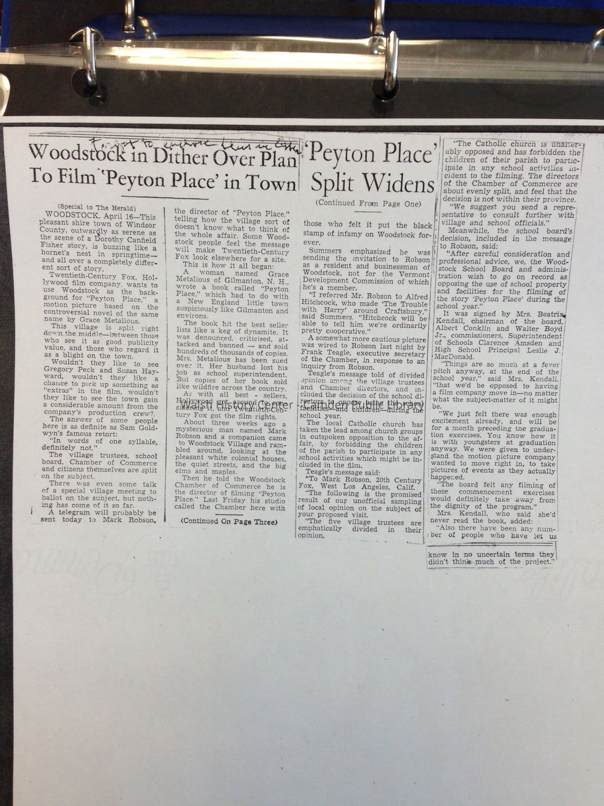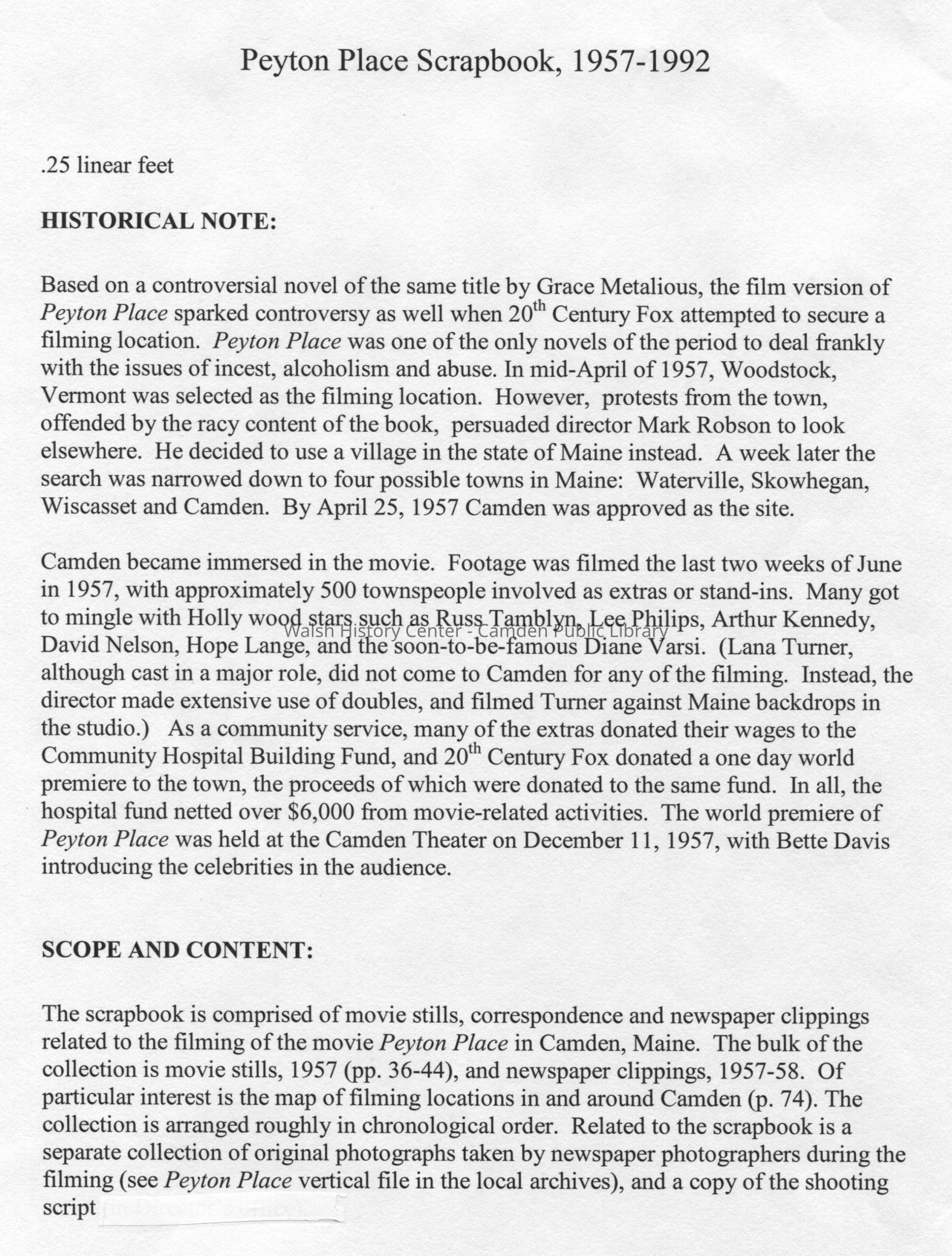 Scrapbook created by Doris Pitcher, librarian at Camden Public Library, Camden, Me., during the filming of Peyton Place in 1957, with other items added by later librarians. Based on a controversial novel of the same title by Grace Metalious, the film version of Peyton Place sparked controversy as well when 20th Century Fox attempted to secure a filming location. Camden became immersed in the movie, footage being filed the last two weeks of June in 1957, with approximately 500 townspeople involved as extras or stand-ins. Chiefly includes movie stills (1957), correspondence, and newspaper clippings (1957-1958) relating to the filming in Camden. Includes a map of filming locations in and around Camden.Collection