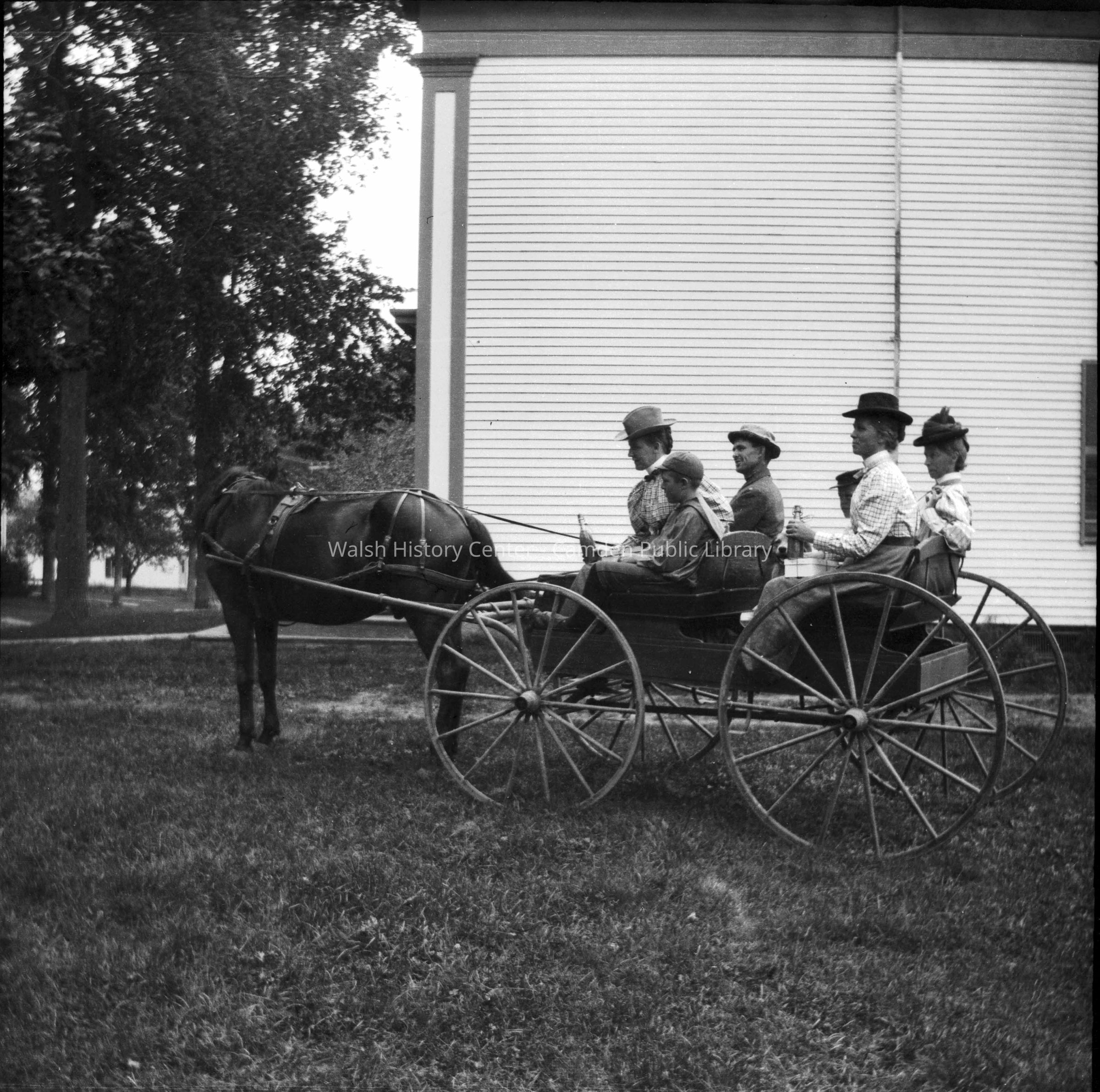 B/W photo of several adults and two children in a horse-drawn buckboard wagon. The photo is labeled "Porter & Buchanan crowd, August 1898."Collection