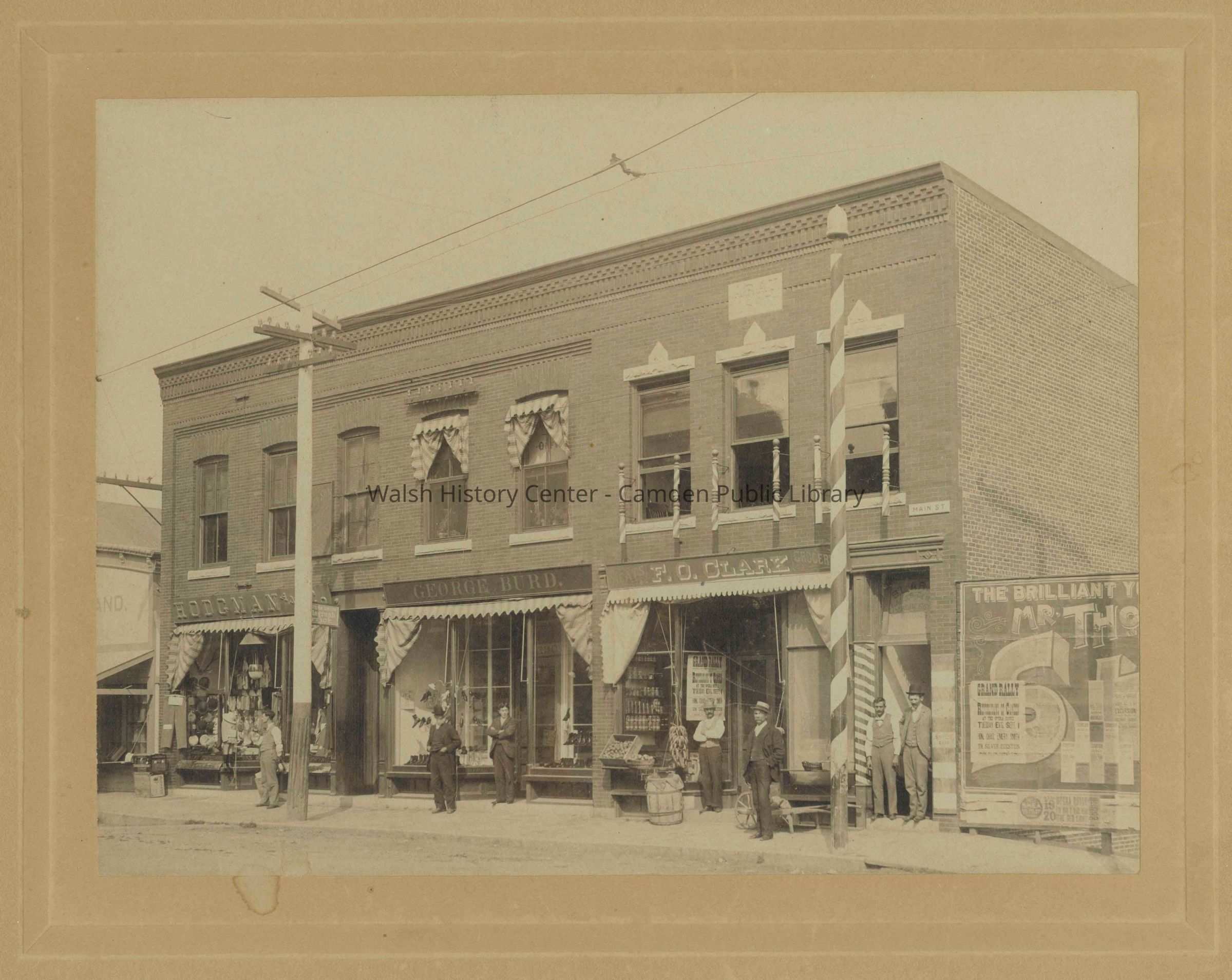 Burd Shoe Store, Camden, Camden Anchor - Rockland Machine Co., Camden High School Class of 1911, Camden Post Office, Cleveland & West Variety Store, F. O. Clark Store, Hodgman & Co., Main Street, Maine, Village Green