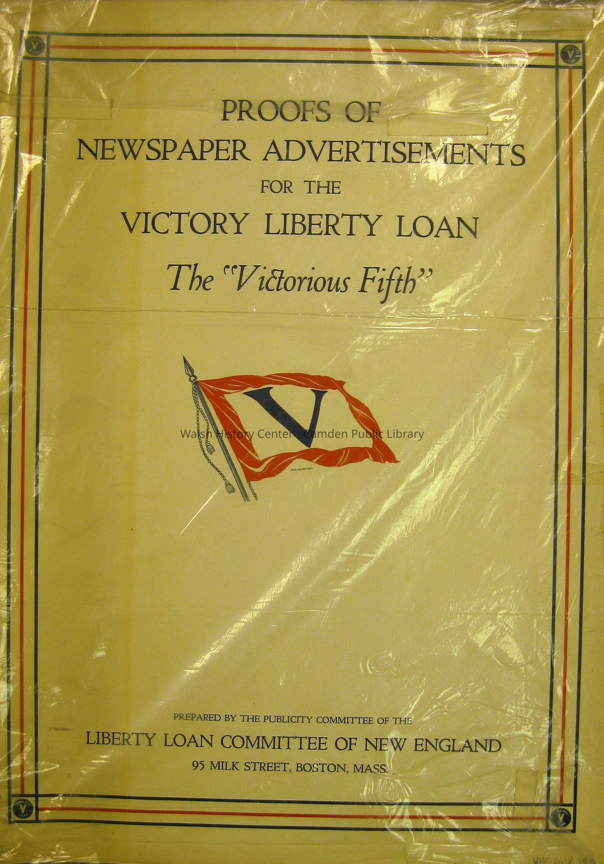PROOFS OF NEWSPAPER ADVERTISEMENTS FOR THE VICTORY LIBERTY LOAN - " THE VICTORIOUS FIFTH. Prepared by the Liberty Loan Committee of New England, 95 Milk Street, Boston, Mass. Tape and staple bound book of 25 sheets, magazine paper, black and white. Prepared for an advertising campaign of 6 weeks covering March 31-May 10. Each advertisement is for a particular date in that time span. Directions for use are printed on the front cover; release dates and an order sheet are on a 9 ½" X 13 3/8" yellow sheet bound before the first proof sheet. That sheet includes the date 1919. This book was sent, rolled, to Chas E. Wood, Esq., Chm., Camden, Maine from the Treasury Department Liberty Loan Committee of Portland, Maine. The cover/wrapper is included, and bears the pencil notation, "5th Loan April 21 to May 10, 1919." NOTE: This book has been preserved in very good condition by being wrapped in a polyethylene sheet.Collection