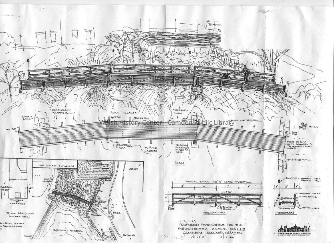 Black and white sketched rendering on bond paper of the proposed footbridge over the Megunticook River waterfall. Bridge was designed by architect Christopher Glass, and sketch shows several aspects of the footbridge with detailed measurements at 1/8" = 1' scale. Bridge was never built.Collection