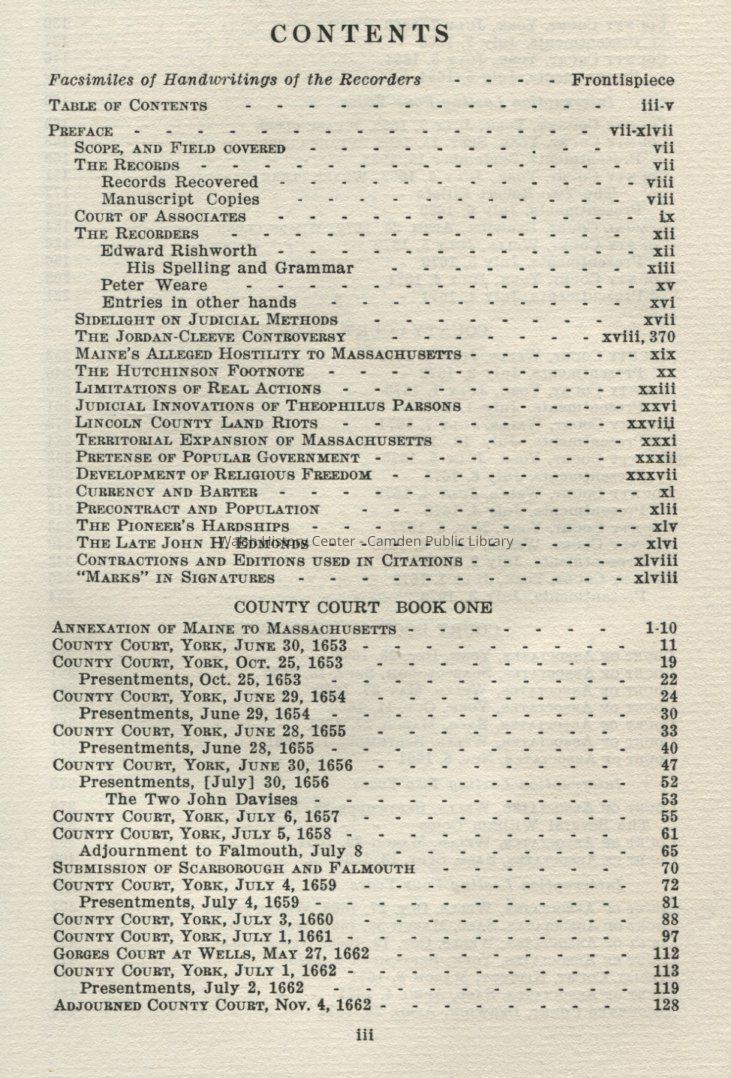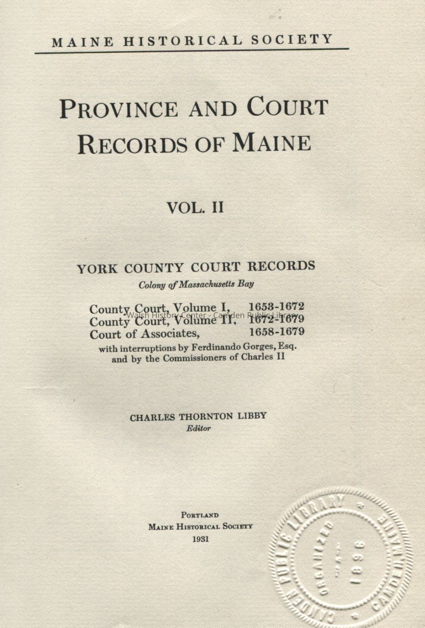 Maine Province and Court Records, Volume 2, published by the Maine Historical Society in 1931. Volume 2 represents records from "York County under the control of Massachusetts in disregard of the Gorges patent."