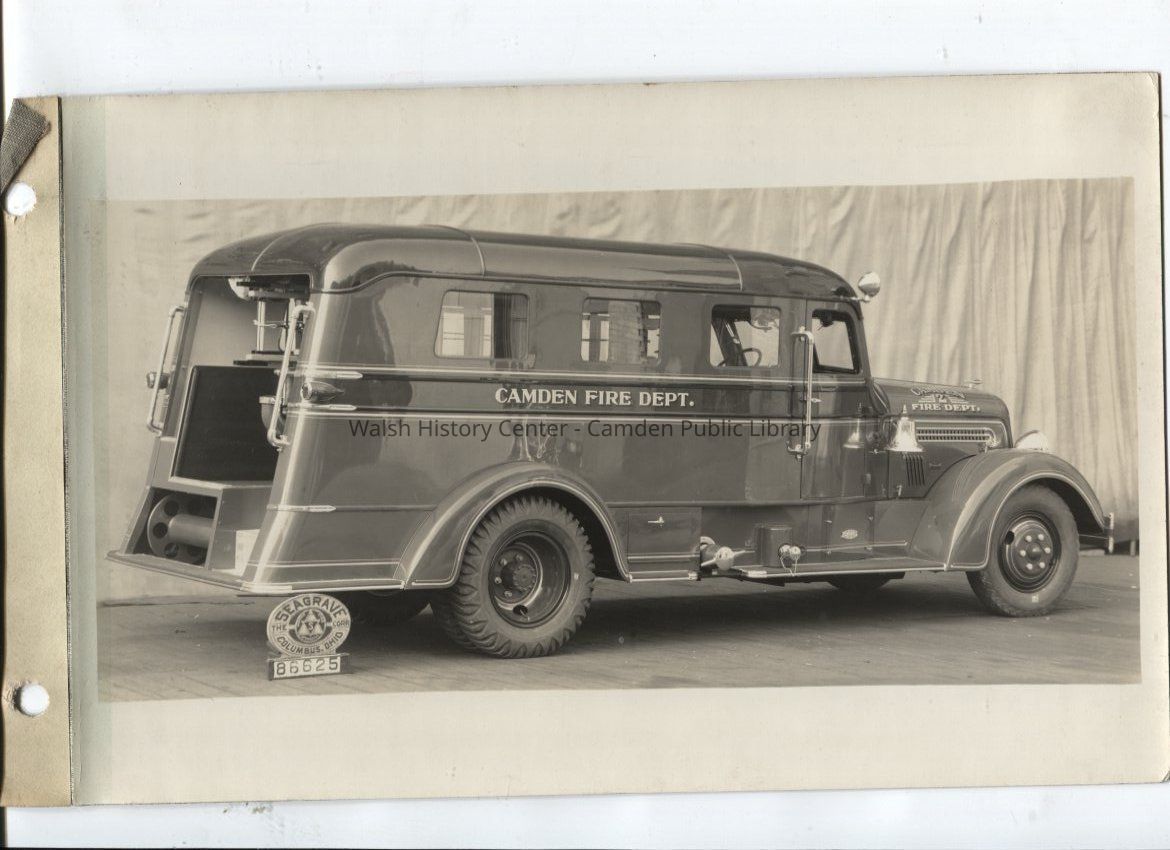 Black and white Seagrave showroom photograph of the Camden Fire Department pumper truck #2 circa 1937. This image shows the new truck facing right.Collection
