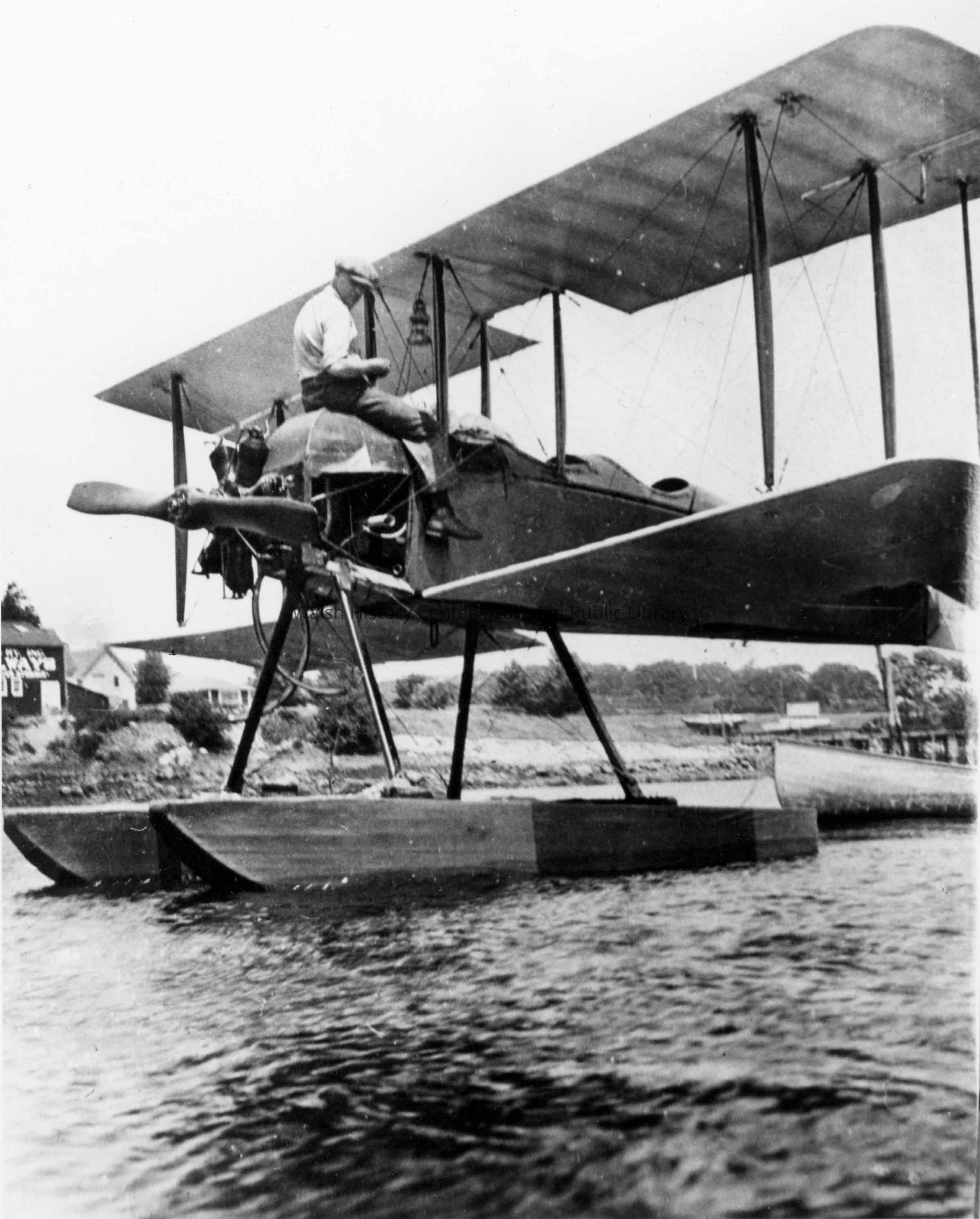 Raymond Henderson of Camden, who built the hydroplane shown in photo, is sitting on top of the engine making repairs. Photo taken in Camden Harbor circa 1930.Collection