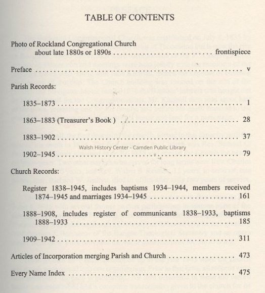 A compilation of the church records of the Rockland Congregational Church and the East Thomaston Congregational Society. Records include parish records (1835 to 1945), minutes of the meetings and financial records. The church records include the register of baptisms and marriages and a register of communicants 1838 to 1933. There is an every name index on page 475. The frontspiece shows a picture of the church taken in the late 1800's.