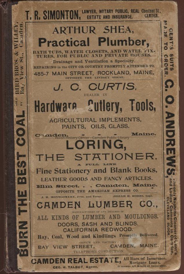 Directory for Camden and Rockport, 1903. Lists residents, streets, businesses, town officers, schools, societies, churches, post offices, libraries for Camden and Rockport. Businesses also listed by industry. Contains full-page advertisements for area businesses. (Second Copy)
