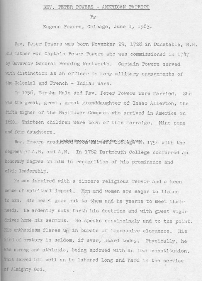 Collection of documents to support the author's quest to have Rev. Powers recognized as a Revolutionary War patriot by the National Committee for Congressional Recognition, June 1, 1963. Reverend Powers was born November 29, 1728 in Dunstable, New Hampshire. His father, Captain Peter Powers, served with distinction as an officer in the French & Indian Wars.