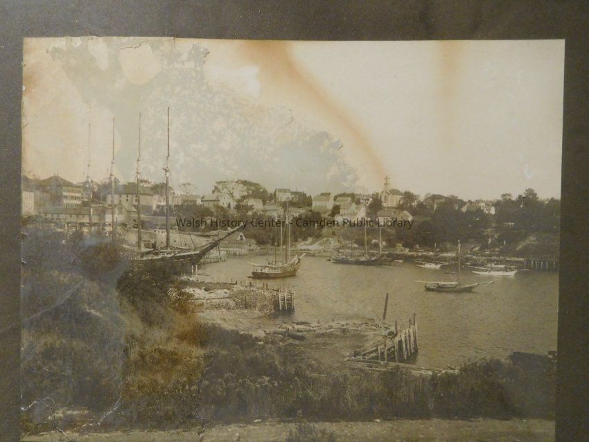 Four-masted schooner is docked on the near side of the harbor. Several smaller schooners are moored in the harbor. The Methodist Church is visible in the distance.