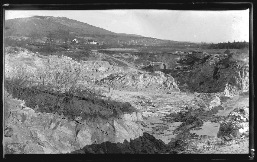 Black and white glass-plate negative image of the lime quarry in Rockport, Maine. Image likely taken circa 1887, prior to the 1907 which ended the lime industry in Rockport.Collection