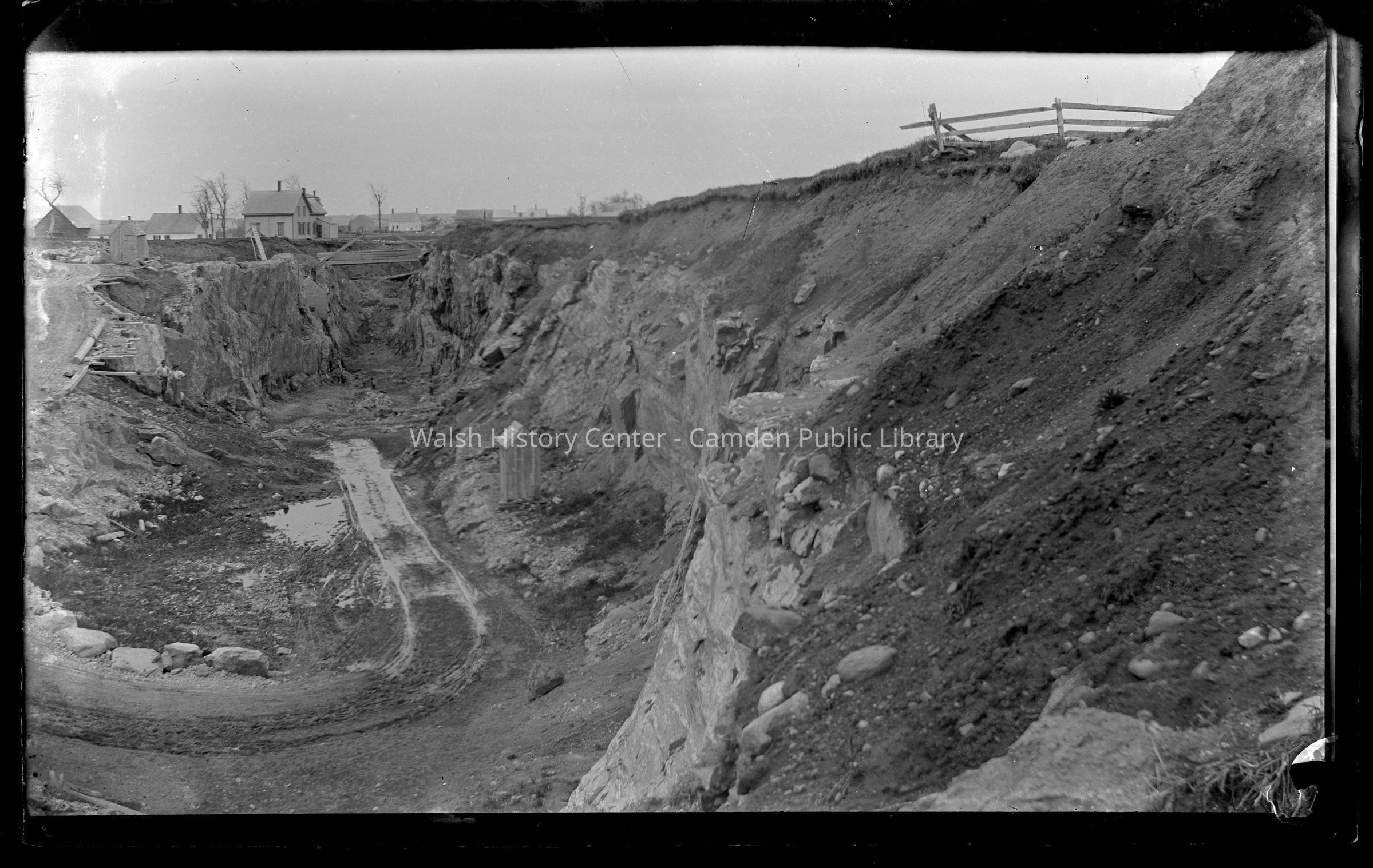 Black and white glass-plate negative image of the lime quarry in Rockport, Maine. Image likely taken circa 1887, prior to the 1907 which ended the lime industry in Rockport.Collection