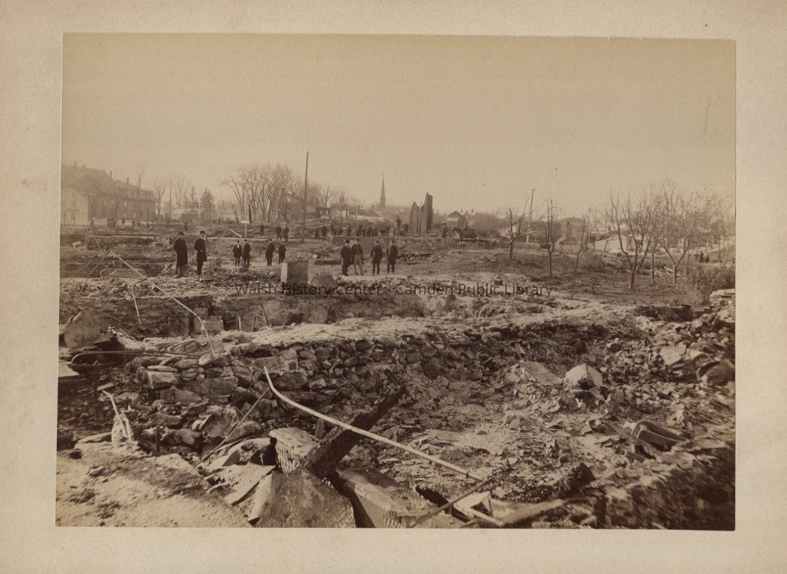 Camden's business district in ruins after the fire of November 1892. The photo is taken from Main Street looking south toward the intersection of Main, Mechanic and Bayview Street. The Congregational Church steeple is visible in the background and the Bay View hotel is on the far left.Collection
