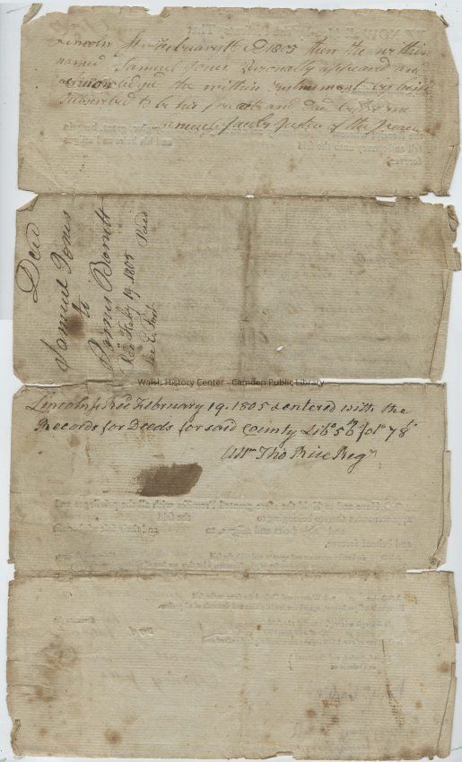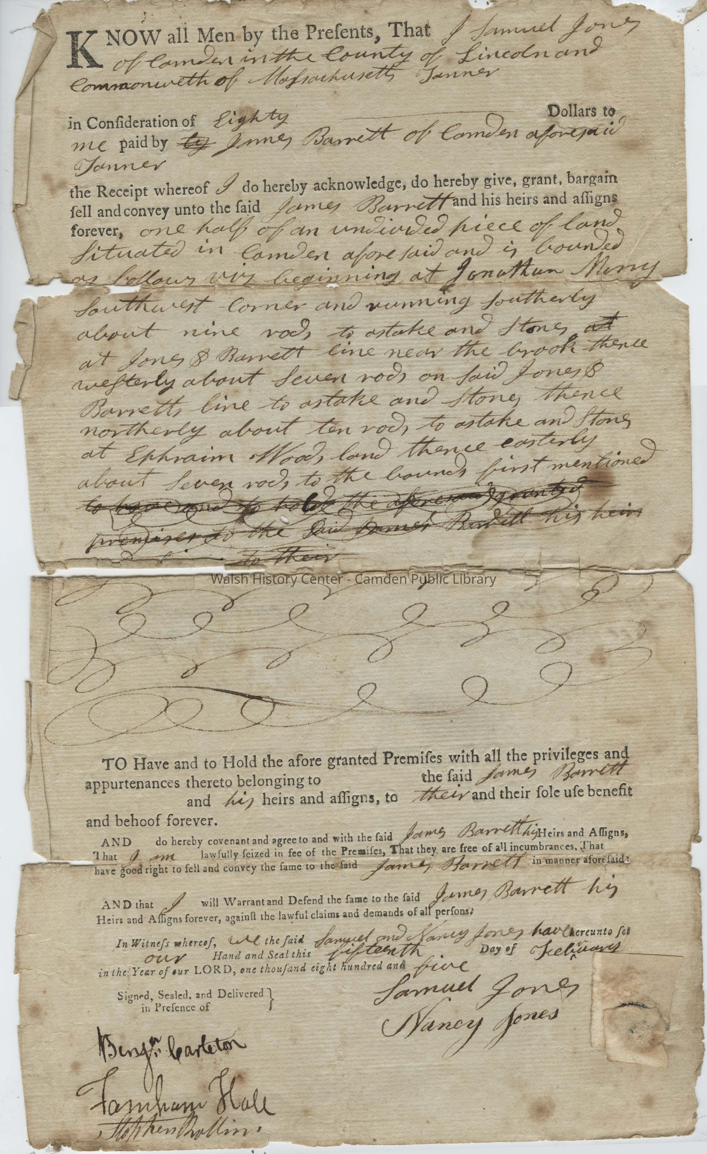 Know all Men by these Presents, That I Samuel Jones of Camden in the County of Lincoln and the Commonwealth of Massachusetts Tanner in Consideration of Eighty Dollars to me paid by James Barrett of Camden aforesaid Tanner the Receipt whereof I do hereby acknowledge, do hereby give, grant, bargain sell and convey unto the said James Barrett and his heirs and assigns forever, one half of an undivided piece of land Situated in Camden aforesaid and is bounded as follows vis beginning at Jonathan [Merry or Morey] Southwest Corner and running southerly about nine rods, to a stake and stones at Jones & Barrett line near the brook thence westerly about Seven rods on said Jones & Barrett line to a stake and stone, thence northerly about ten rods to a stake and Stone, thence northerly about ten rods to a stake and Stone at Ephraim Woods land thence easterly about Seven rods to the bounds first mentioned