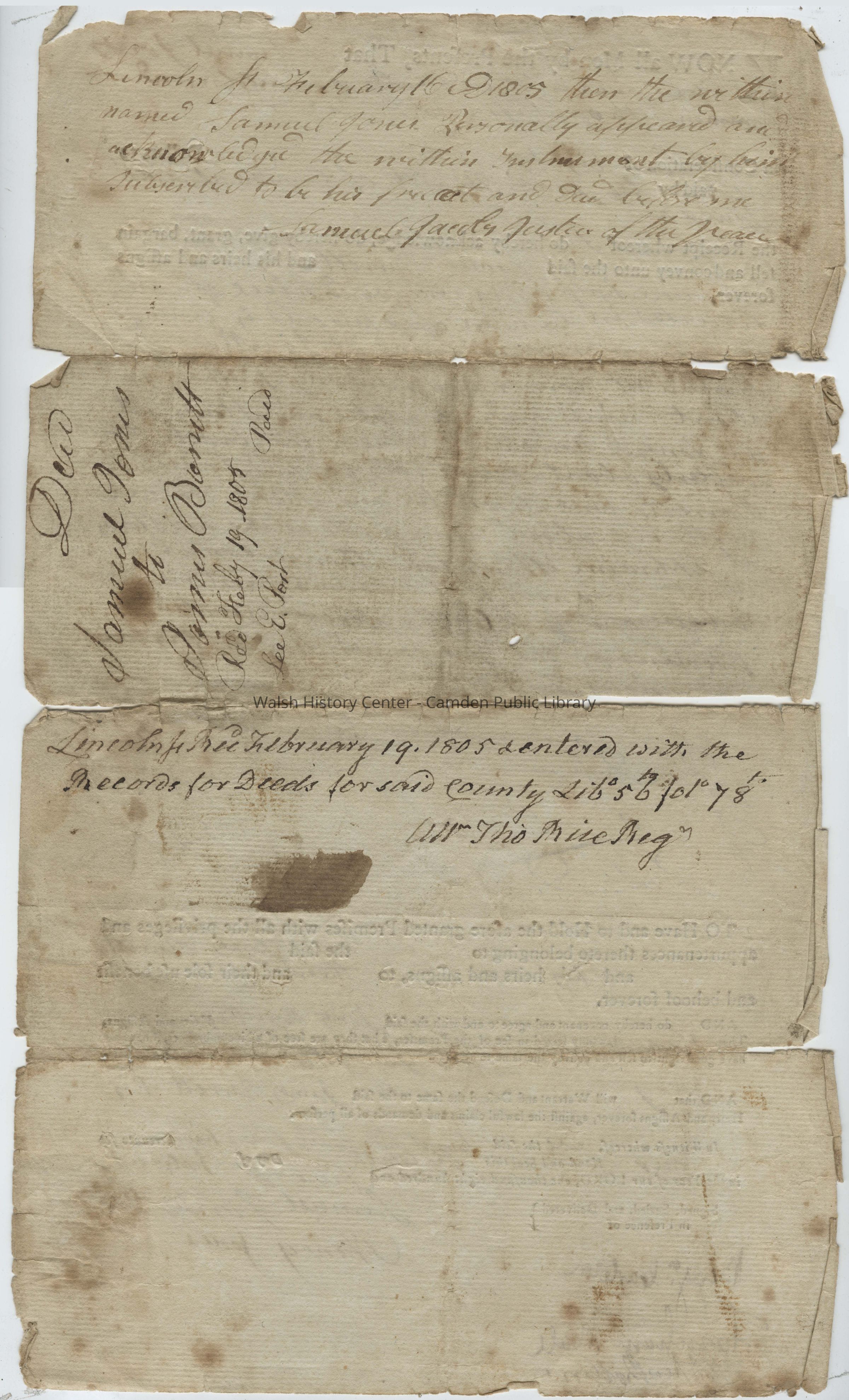 Lincoln ss February 16 1805 then the witness named Samuel Jones Personally appeared and acknowledged the written testament by him subscribed to be his free act and deed before me