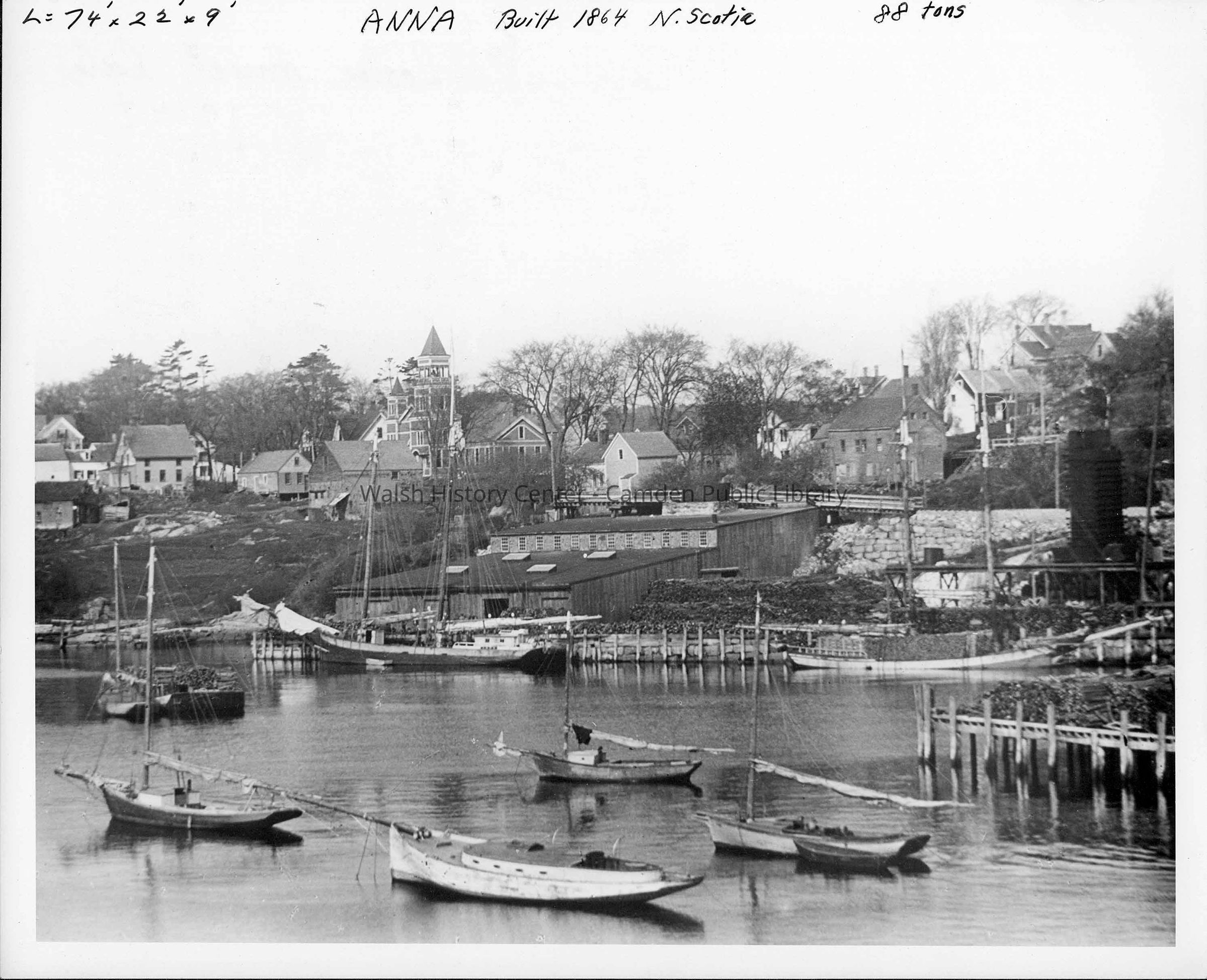 Schooner "Anna" dockside at Rockport kiln shed circa 1900. The ship was built at Wilmot, Nova Scotia in 1864. Tonnage: 88 tons, Length: 74.8 ft., Beam: 22.4 ft., Depth: 8.9 ft. Home port Annapolis, N.S., Official # 52032Collection