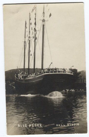 Postcard of the launch of the schooner "Blue Peter" in Camden, Maine.Collection