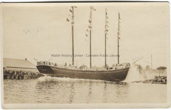 Postcard of the launch of the schooner "Blue Peter" in Camden, Maine.Collection