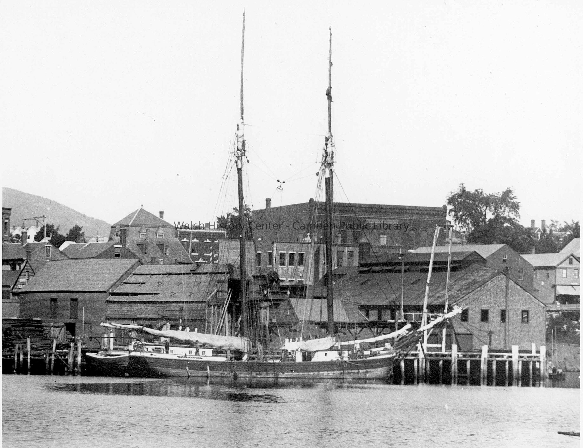 Schooner "Mark Pendleton" docked on the western side of Camden harbor near the grist mill and anchor factory. The vessel was built in Bangor in 1874 and measured 110' x 26.7' x 8.9', 199 tons. The photo was taken after the 1892 fire, which destroyed the downtown business district and resulted in the new buildings being constructed out of brick, as seen in the background.Collection