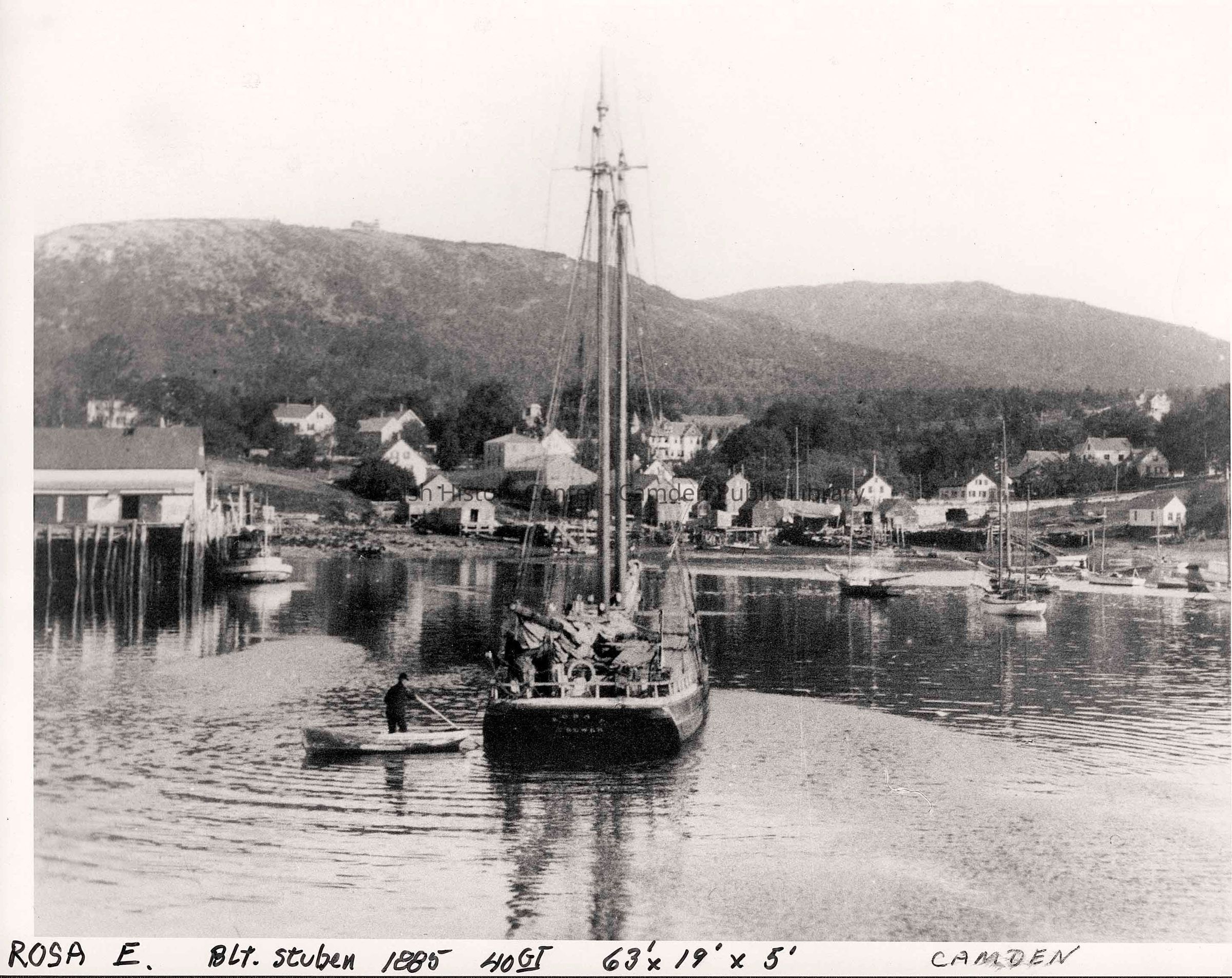 2-masted schooner "Rosa E." in Camden harbor circa 1890. The vessel was built at Steuben, ME in 1885. Tonnage - 40, Length - 61.4 ft., Beam - 19 ft., Depth - 5.1 ft. Home port Bangor, ME