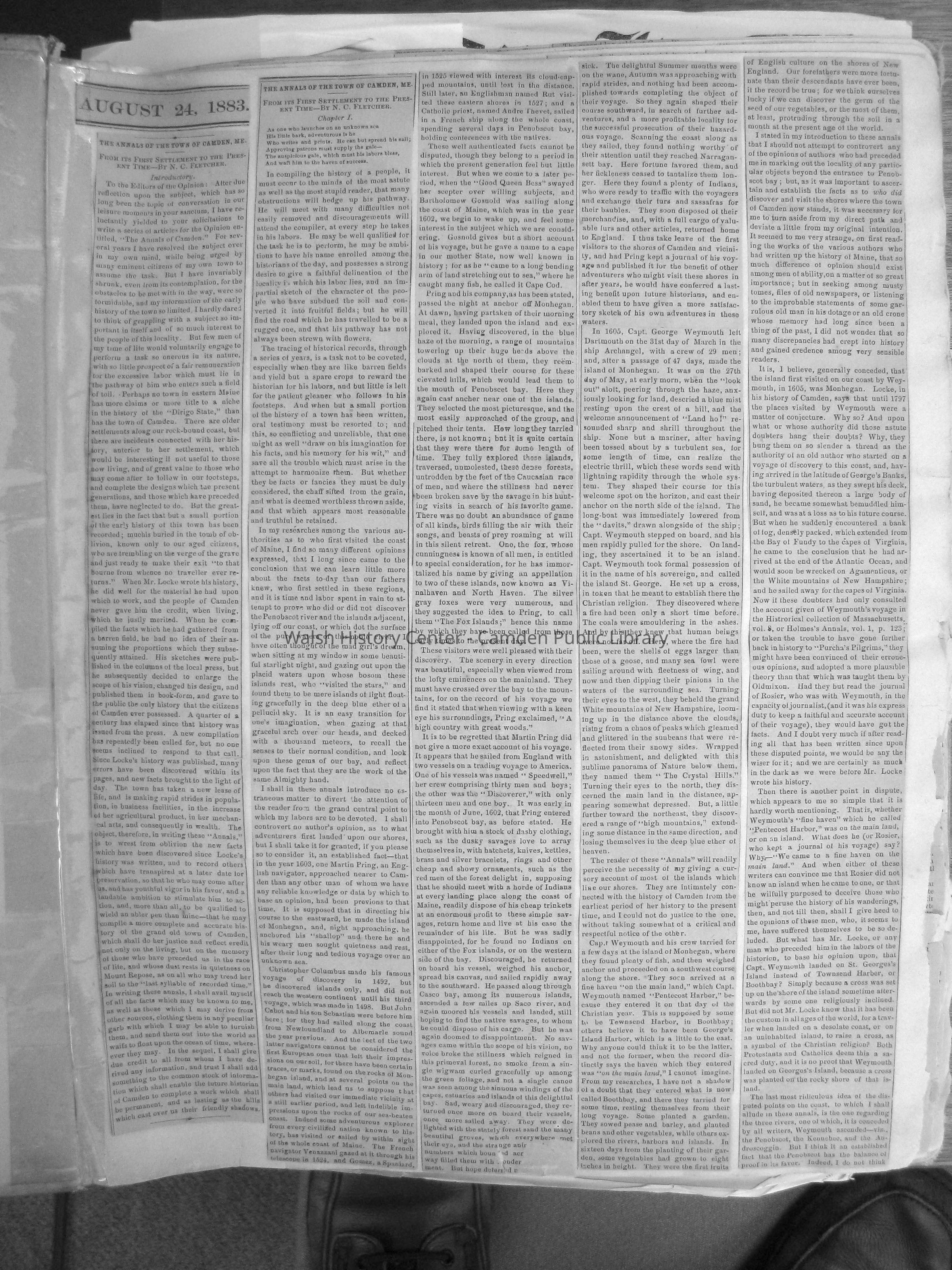 Scrapbook donated by Mrs. Reuel Robinson, containing the text of N.C. Fletcher's "The Annals of the Town of Camden, ME" published in the newspaper the Rockland Opinion in 1883 and 1884. Pages 1-22 contain the Annals. Pages 23-33 contain several "Camden and Vicinity" columns by "Sigma" presumably also from the Rockland Opionion, undated. Pages 44-46 contain clippings of the column "Reminiscences", numbered I - IV, by Reuel Robinson. Handwritten note on p. 44 describes the clippings of the Reminiscences as "Camden in the 1880s (Published in 1913)".