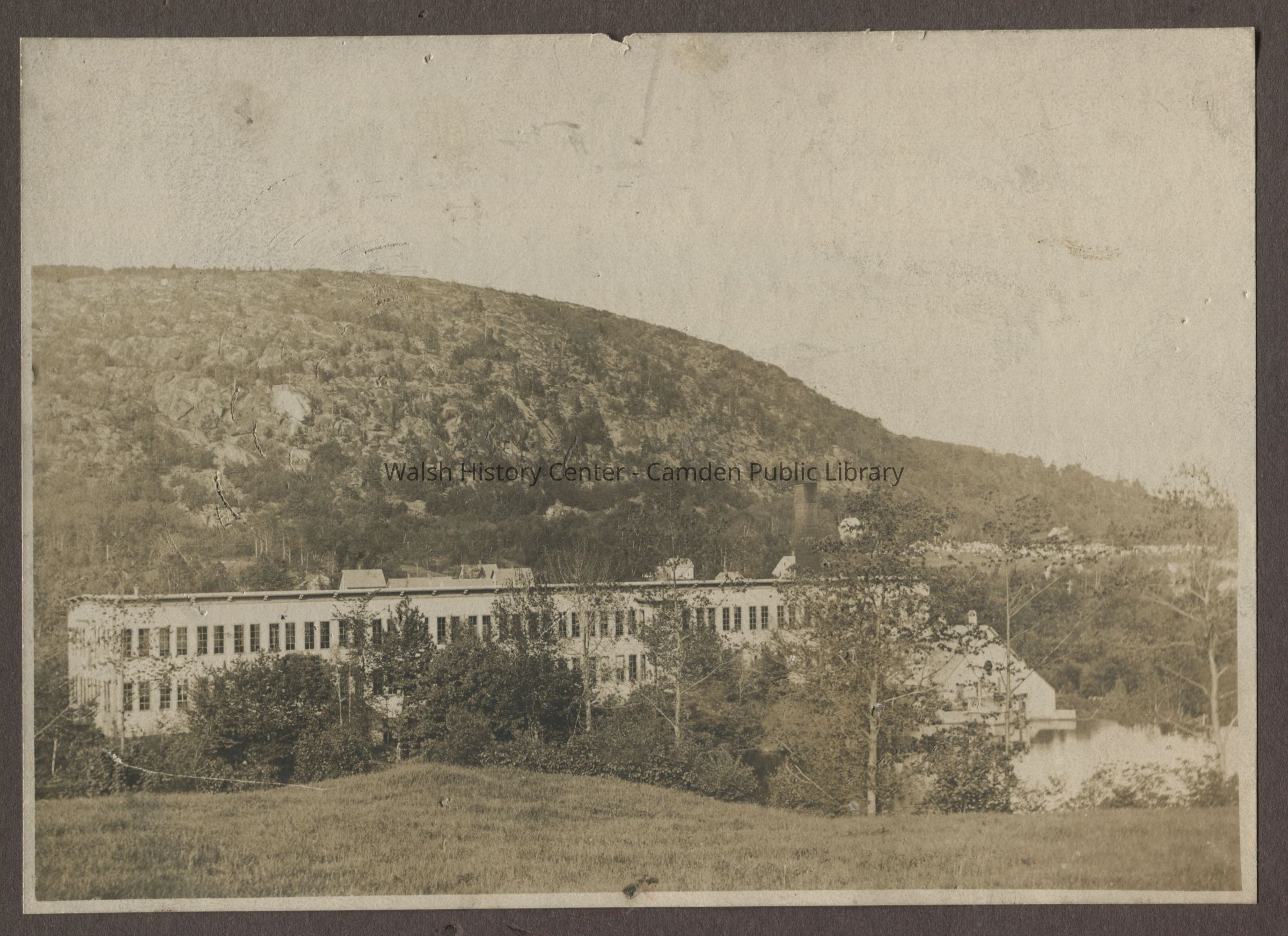 Photograph of the Seabright Mill on the Megunticook River. Photo is unlabeled and undated but possibly taken in the 1920s. Mounted on cardboard mat which is crumbling along all edges.Collection