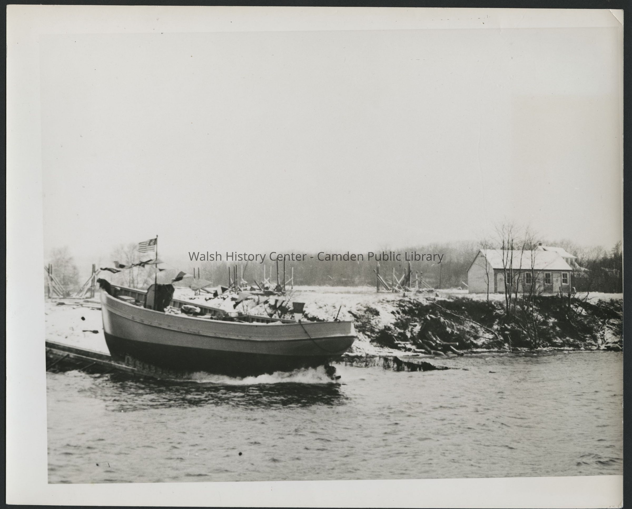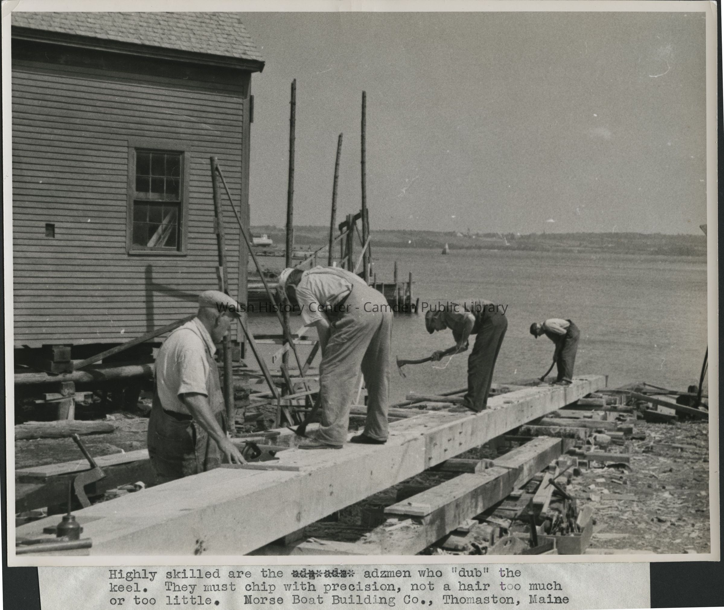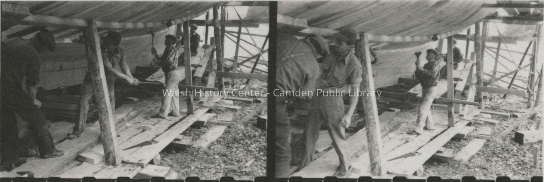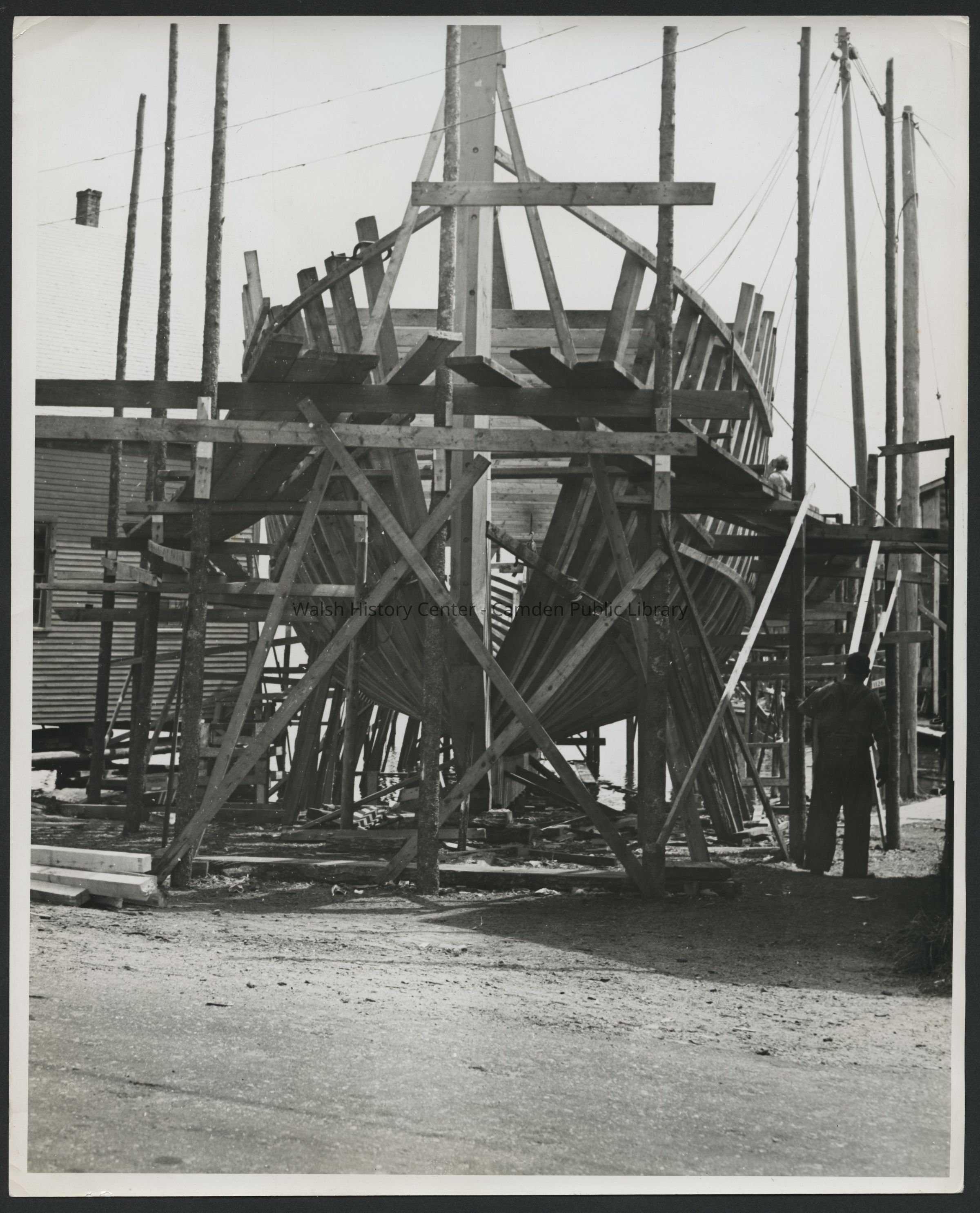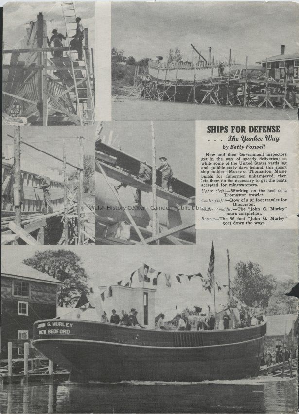 Collection of 16 photographs and two articles about shipbuilding at the Morse shipyard in Thomaston, Maine. The shipyard built fishing trawlers that were converted for use as minesweepers during World War II.Collection