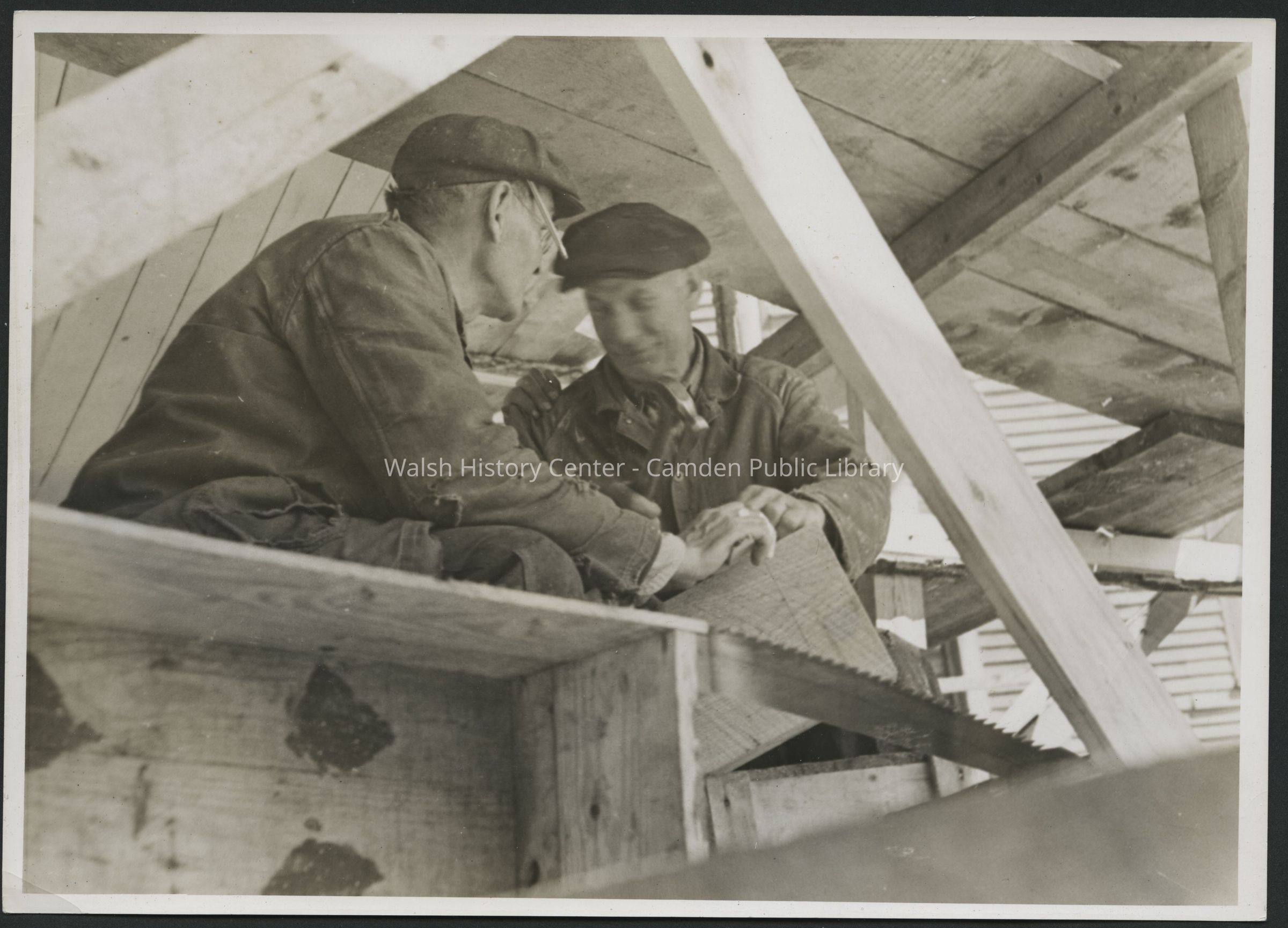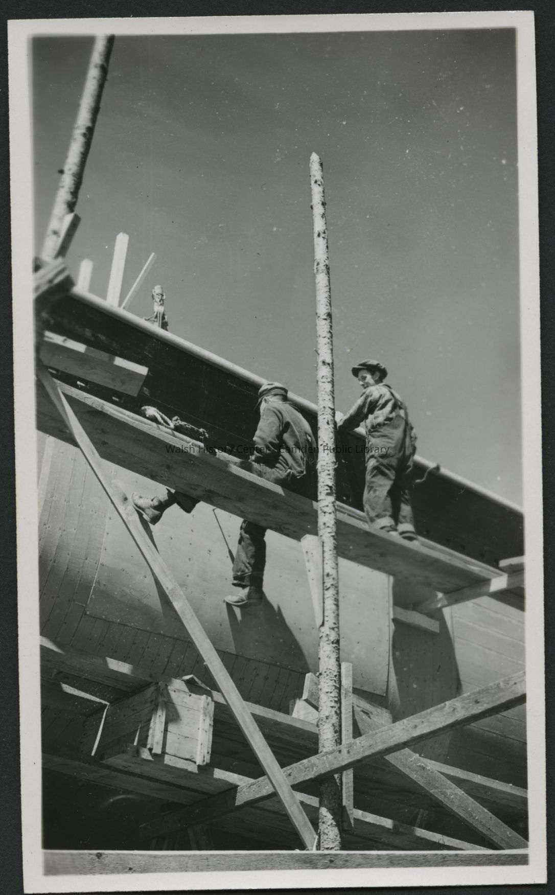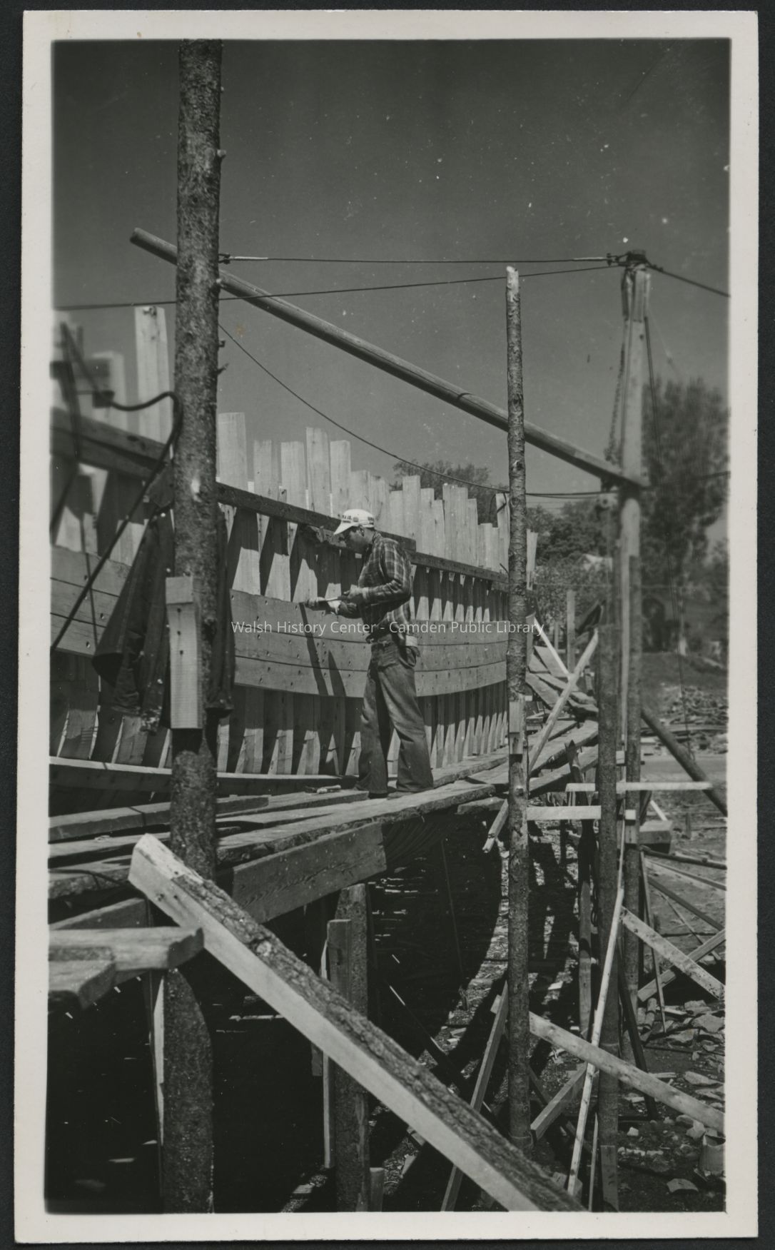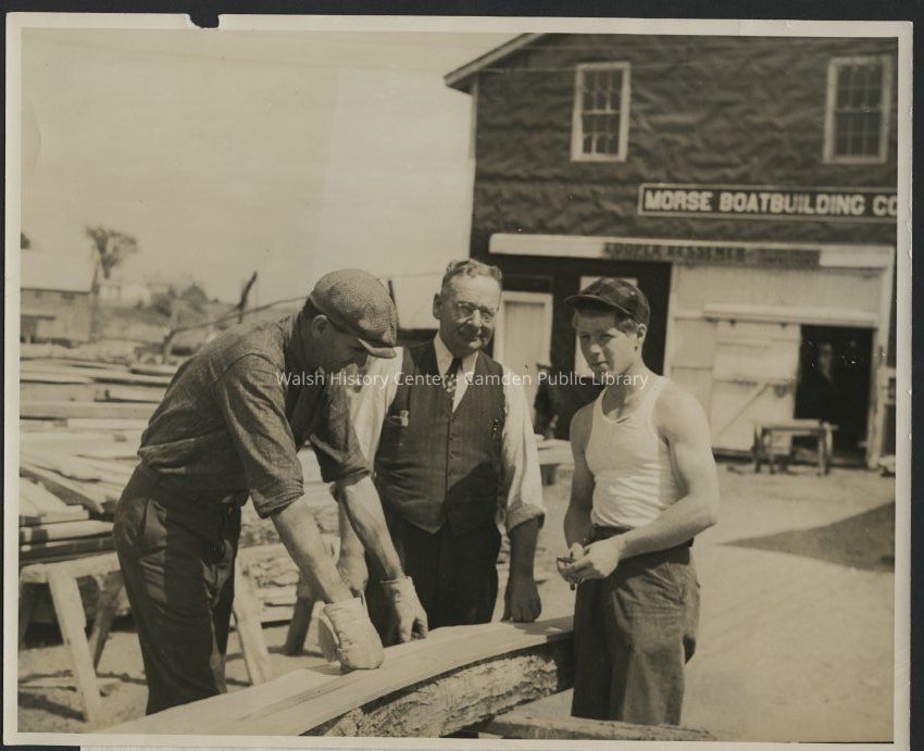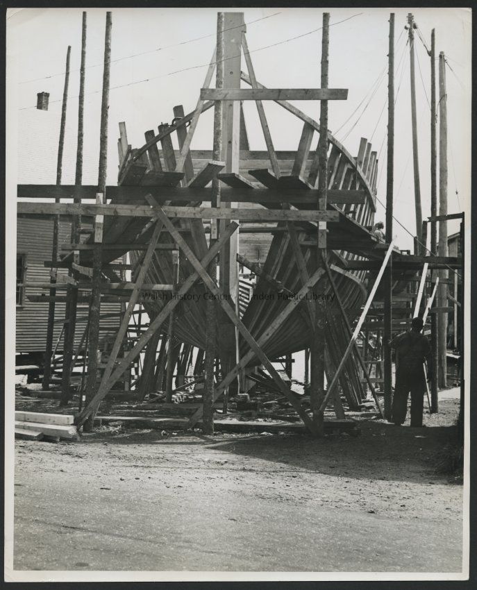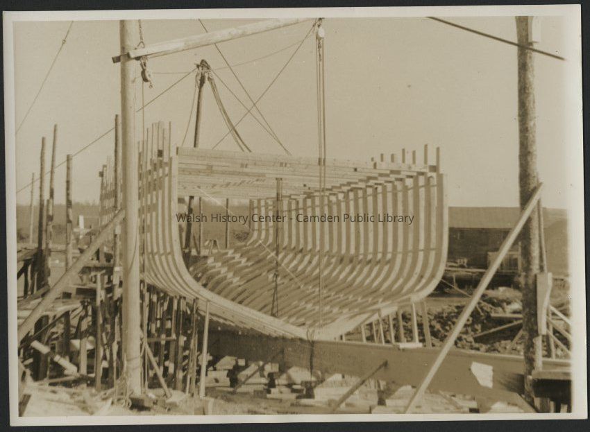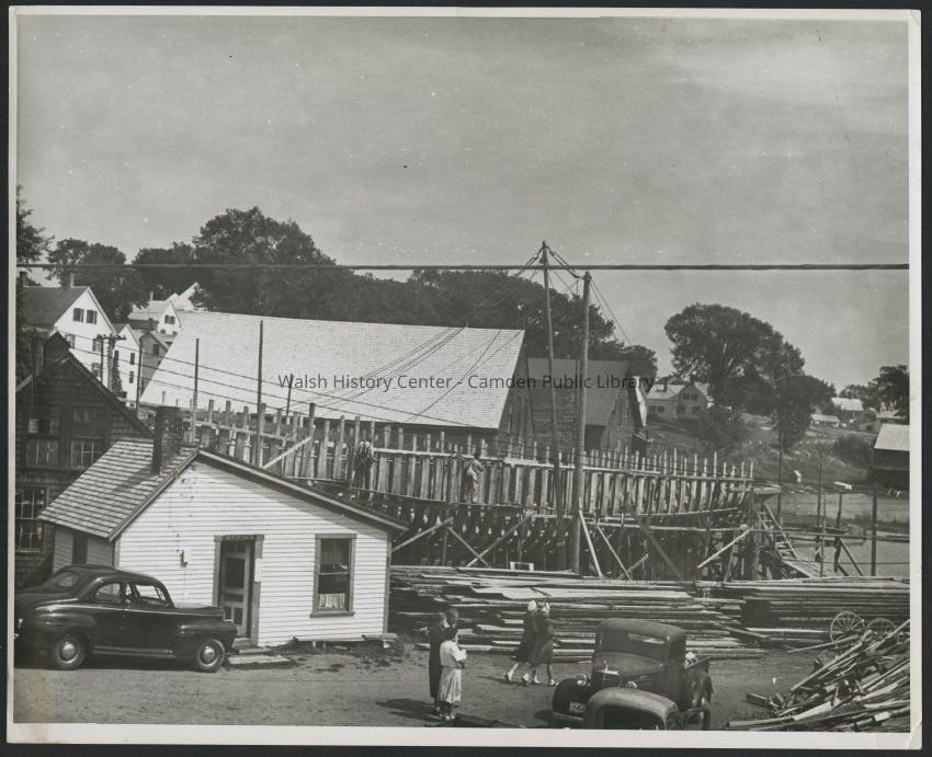 Collection of 16 photographs and two articles about shipbuilding at the Morse shipyard in Thomaston, Maine. The shipyard built fishing trawlers that were converted for use as minesweepers during World War II.Collection