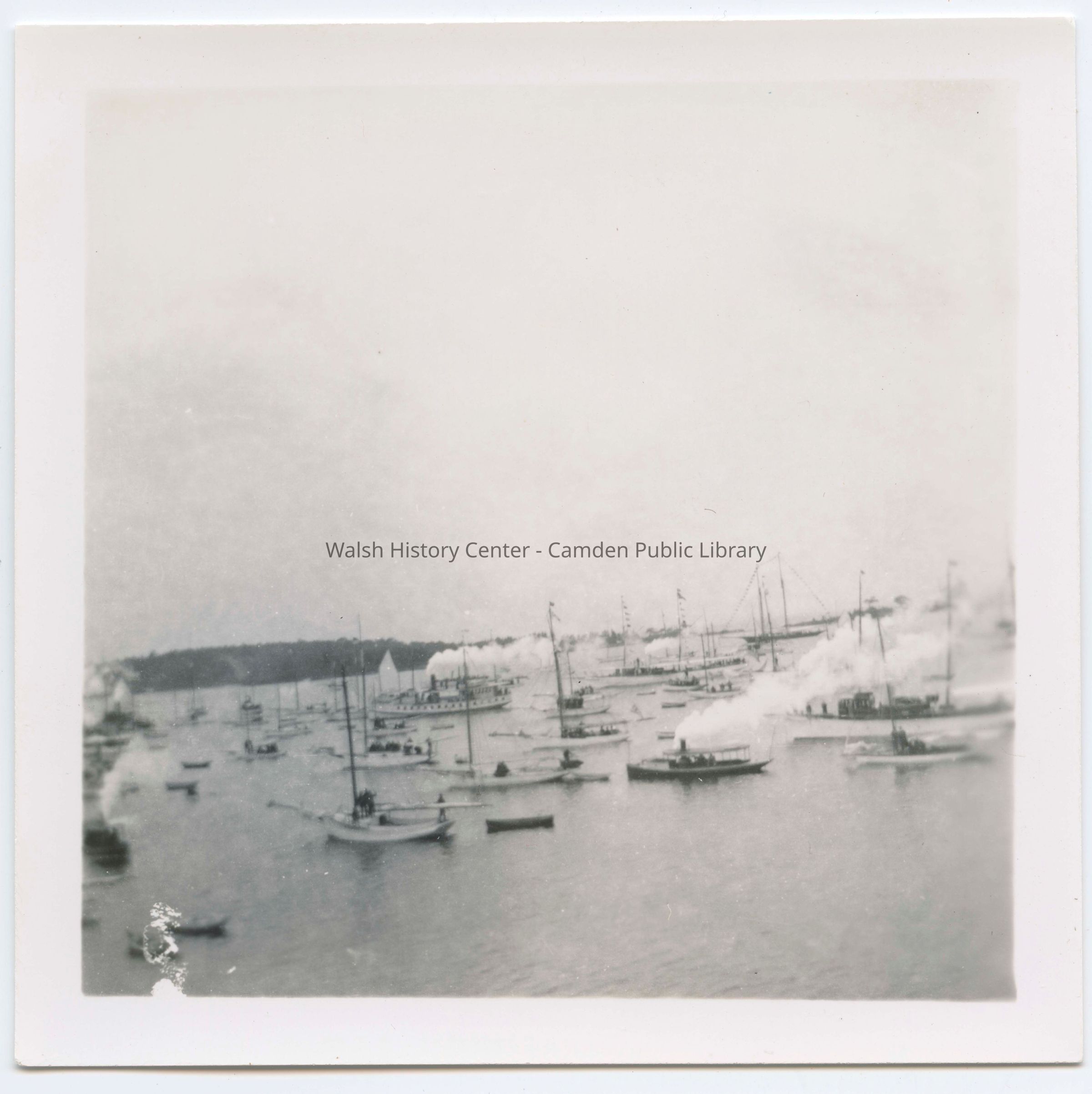 Black and white photograph from the deck of the George W. Wells on August 14, 1900. Photo shows large number of ships gathered in the outer harbor to watch the launching.Collection