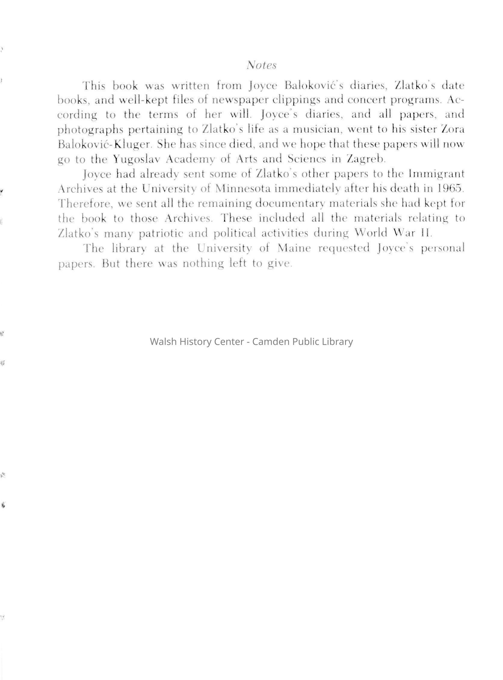 Memoirs of Joyce Balokovic of her life with Zlatko Balokovic, concert violinist. Published posthumously by her daughter. Descriptions of Inter-war years, World War II, anti-Semitism as well as numerous world wide concert tours plus details of audiences with heads of state and religious leaders.Collection