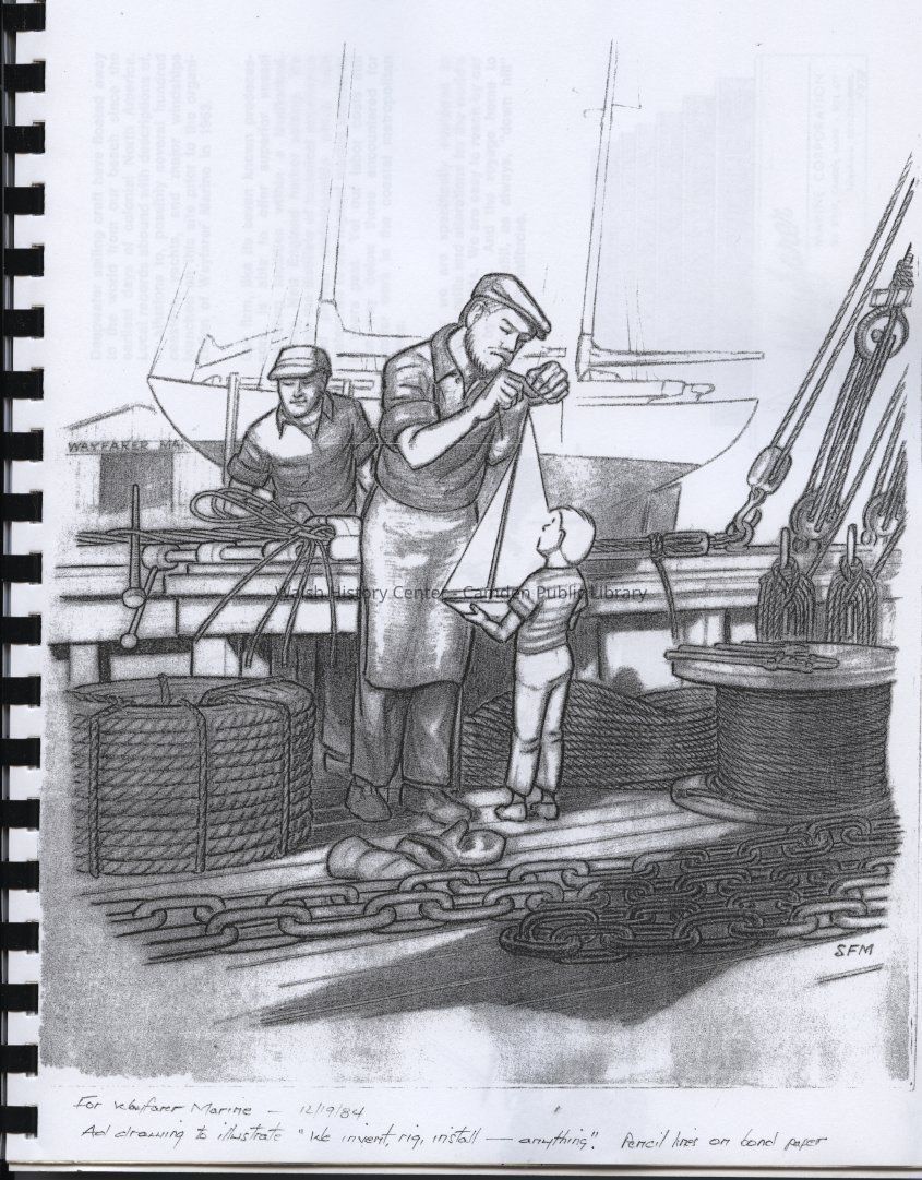 Spiral bound book entitled "Some Line Drawings" by Samuel F. Manning. Drawings were made for Camden Shipbuilding Co. and Wayfarer Marine as advertisements from 1962-1984.