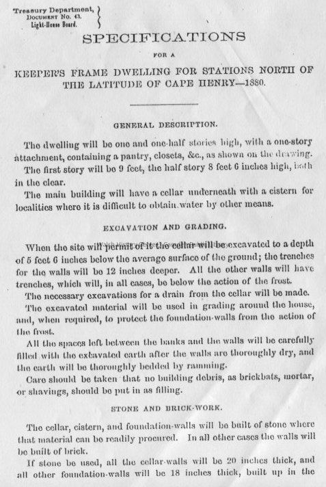 Photocopy of Treasury Department Document No. 43, Lighthouse Board Specifications for a Keeper's Frame Dwelling for Stations North of the Latitude of Cape Henry, 1880. Copied from original document in the National Archives.Collection