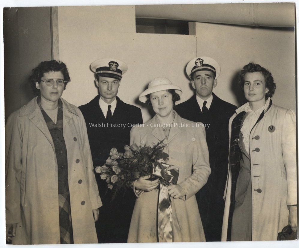 Photograph taken at the Sponsor's Party for the barge APC 15 launched from Camden Shipbuilding & Marine Railway Co. in July 1942. The men are not identified. The women are the spouses of the owners of the shipyard. Left to right are Helena Bok, Marion Lunt, and Lois Lyman.Collection