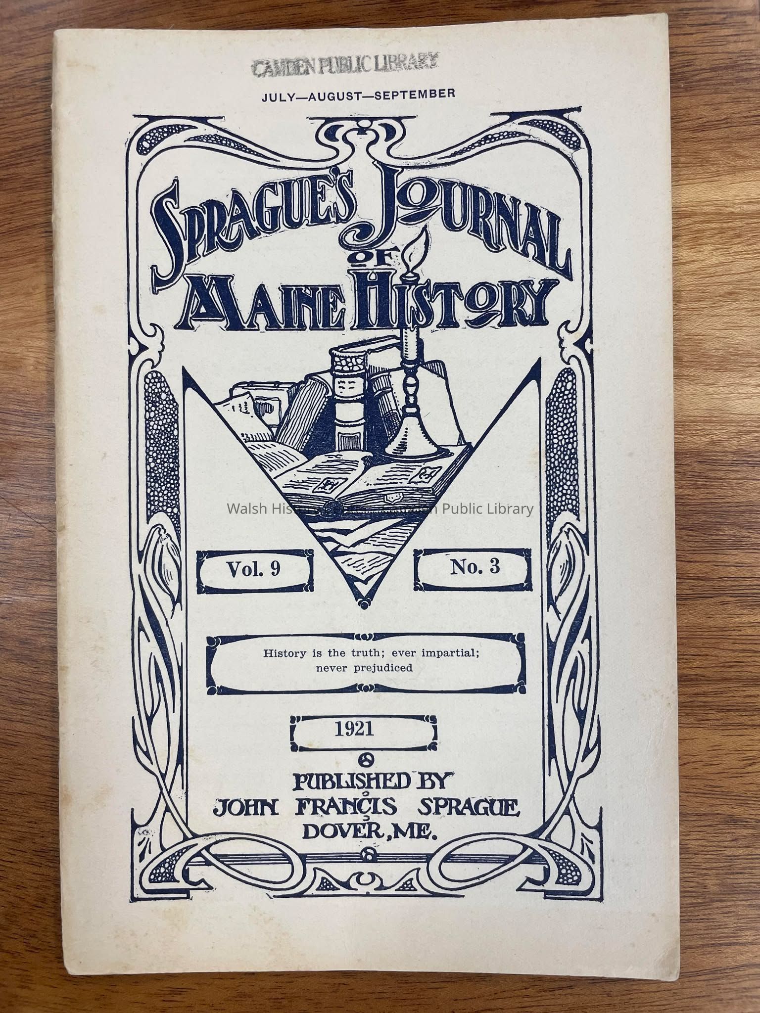 This is Vol. 9 No.3 of Sprague's Journal of Maine History published by John Francis Sprague in Dover, Maine. This issue is for the months of Jul., Aug., and Sept. 1921. This issue contents include: