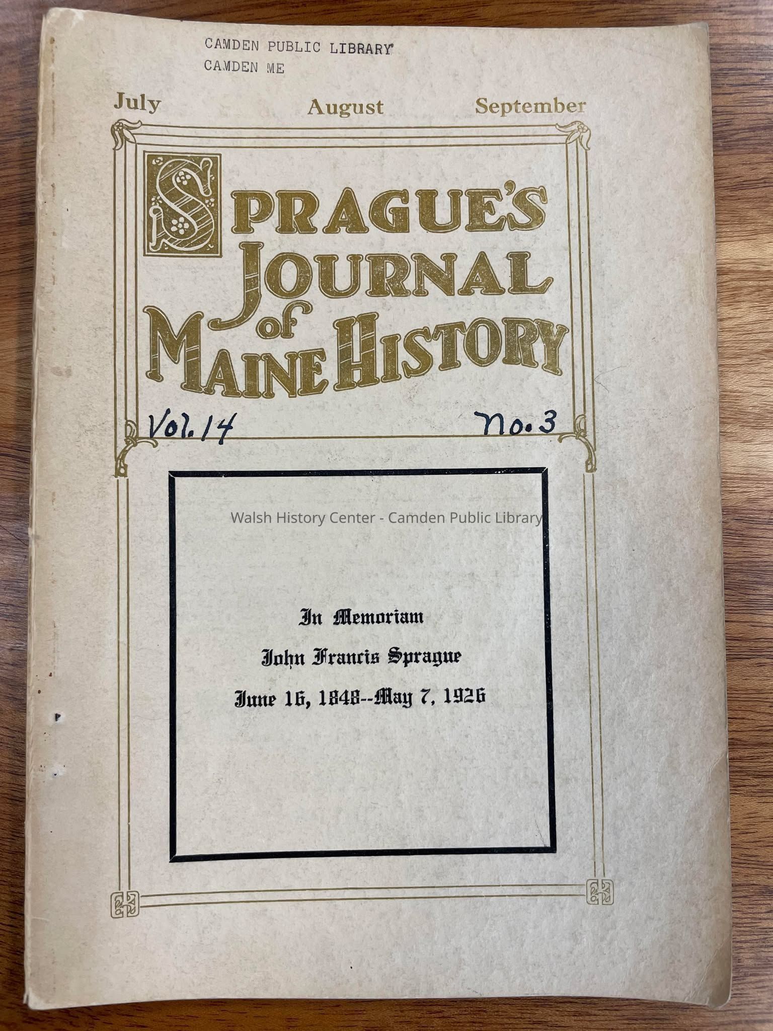 This is Vol. 14 No.3 of Sprague's Journal of Maine History published by John Francis Sprague in Dover, Maine. This issue is for the months of July, Aug., & Sept. 1926. This issue contents include: