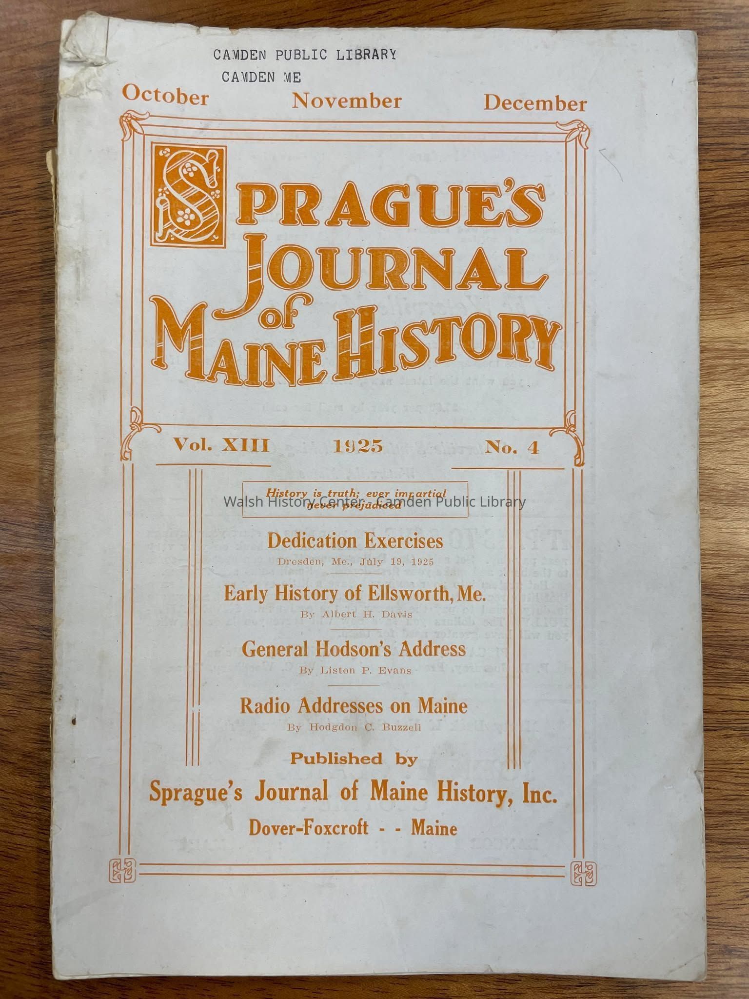 This is Vol. 13 No.4 of Sprague's Journal of Maine History published by John Francis Sprague in Dover, Maine. This issue is for the months of Oct., Nov., and Dec. 1925. This issue contents include: