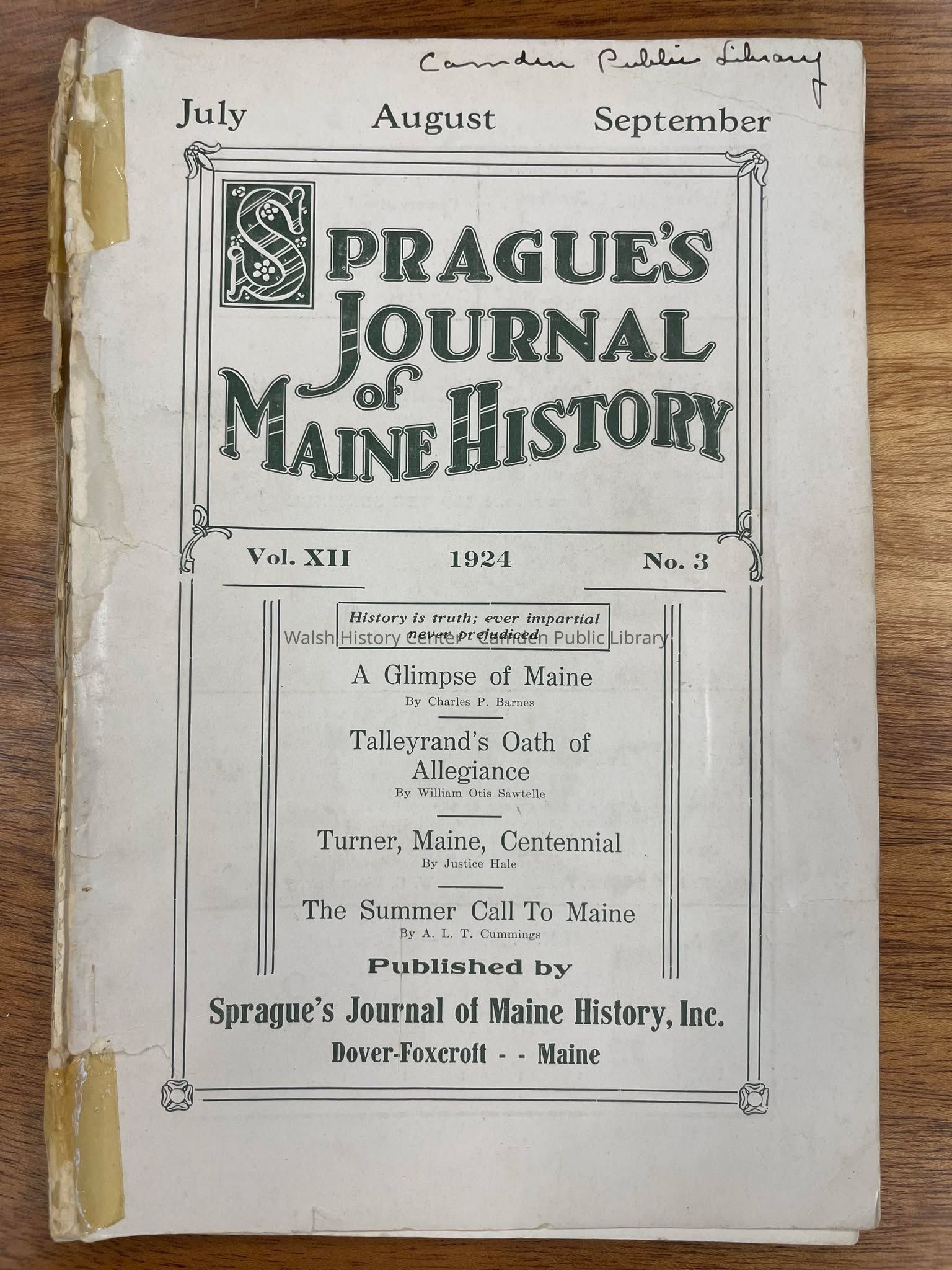 This is Vol. 12 No.3 of Sprague's Journal of Maine History published by John Francis Sprague in Dover, Maine. This issue is for the months of Jul., Aug., & Sept. 1924. This issue contents include: