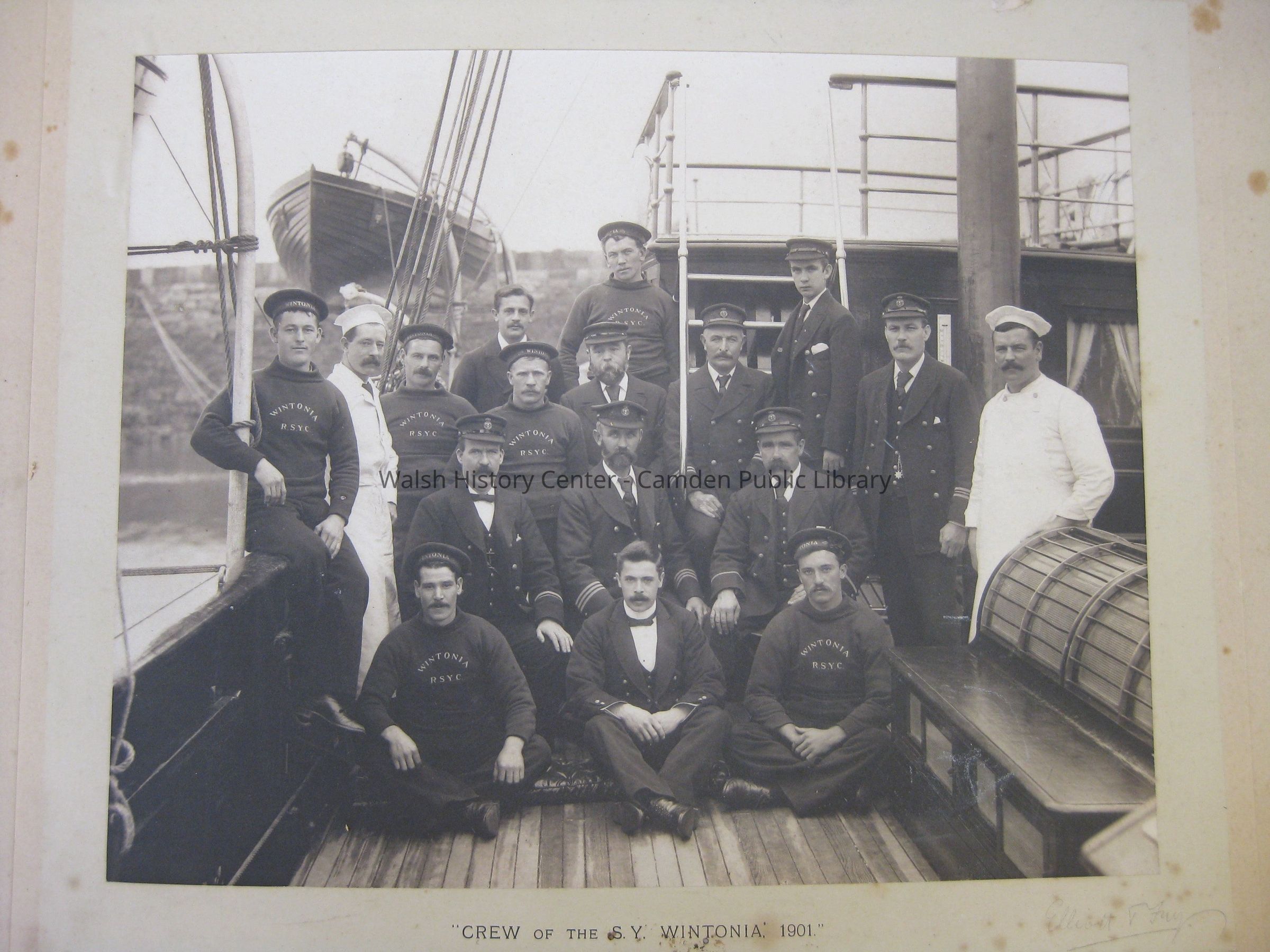Sepia photograph of the crew of the steam yacht "Wintonia." It is mounted on 16 x 20" cardboard backing. The luxury steam yacht WINTONIA was built by Day, Summers and Co. In Southampton, England in 1894 for her owner F.H. Punton. She weighed 233 tons and measured 137'LOA x 19.2'B x 11.2'D.